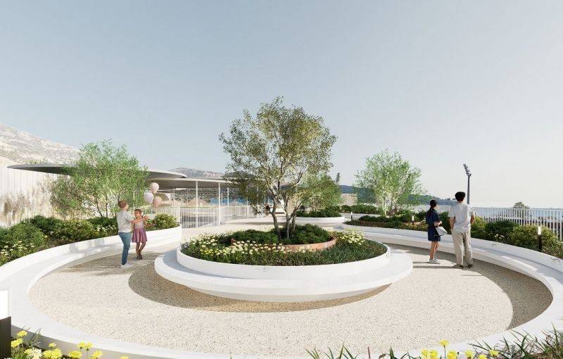 Στην κορυφή του κτιρίου, η “πράσινη” ταράτσα προσφέρει πανοραμική θέα 360 μοιρών προς τη θάλασσα και το γύρω τοπίο. Ο σχεδιασμός της περιλαμβάνει κυκλικές φόρμες που δημιουργούν ξεχωριστές ζώνες χαλάρωσης και κοινωνικής αλληλεπίδρασης, ενισχύοντας την αίσθηση κοινότητας μεταξύ των κατοίκων.