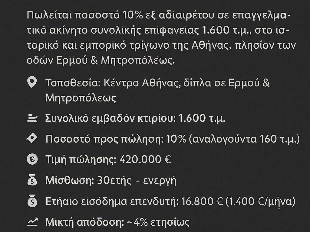 Πωλείται Ποσοστό 10% (160 τ.μ.) σε Μισθωμένο Επαγγελματικό Κτίριο στο Κέντρο της Αθήνας Πωλείται ποσοστό 10% εξ αδιαιρέτου σε επαγγελματικό ακίνητο συνολικής επιφάνειας 1.600 τ.μ., στο ιστορικό και εμπορικό τρίγωνο της Αθήνας, πλησίον των οδών Ερμού & Μητροπόλεως. Το ακίνητο είναι μισθωμένο σε γνωστή ξενοδοχειακή αλυσίδα με 30ετές συμβόλαιο, εξασφαλίζοντας μακροχρόνιο παθητικό εισόδημα. Τοποθεσία: Κέντρο Αθήνας, δίπλα σε Ερμού & Μητροπόλεως Συνολικό εμβαδόν κτιρίου: 1.600 τ.μ. ️ Ποσοστό προς πώληση: 10% (αναλογούντα 160 τ.μ.) Τιμή πώλησης: 420.000 € Μίσθωση: 30ετής – ενεργή Ετήσιο εισόδημα επενδυτή: 16.800 € (1.400 €/μήνα) Μικτή απόδοση: ~4% ετησίως Ιδανική επιλογή για επενδυτές που αναζητούν ασφαλές, σταθερό και υψηλού κύρους ακίνητο, με εγγυημένο εισόδημα και ελάχιστο ρίσκο. Η αναγραφή ενεργειακής κατηγορίας γίνεται μόλις υπάρχει διαθέσιμο ΠΕΑ, σύμφωνα με τον ν. 4122/2013 Πληροφορίες & ραντεβού: Μεσιτικό Γραφείο ΚΡΗΣΣΑ ΓΗ 6974599904