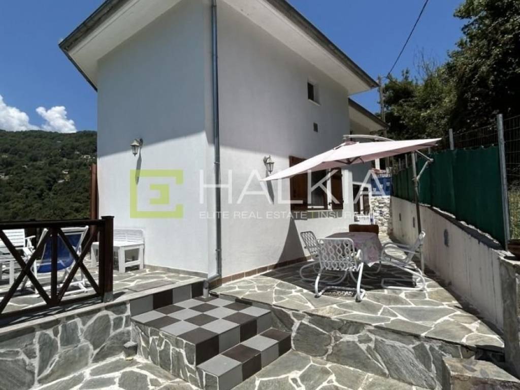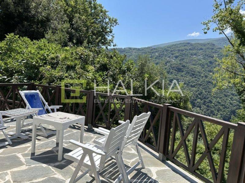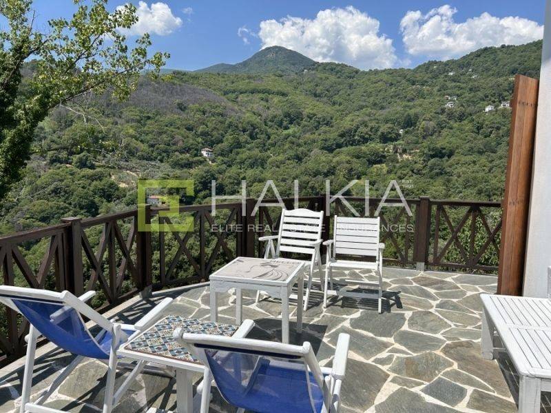 Η μεγάλη βεράντα αποτελεί σημείο αναφοράς του σπιτιού, προσφέροντας ανεμπόδιστη θέα στο καταπράσινο βουνό του Πηλίου, με απόλυτη αίσθηση απομόνωσης, ηρεμίας και αρμονίας με τη φύση. Από κάθε σημείο του οικοπέδου απολαμβάνει κανείς πανοραμική θέα σε ένα τοπίο που αλλάζει μαγικά ανάλογα με την ώρα της ημέρας. Στο διαμορφωμένο εξωτερικό περιβάλλον υπάρχουν διάφορα σημεία χαλάρωσης, είτε για καφέ στο πρωινό φως, είτε για δείπνο.