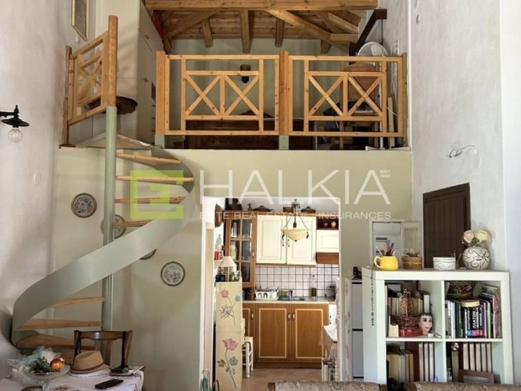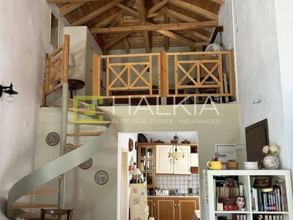 Το εσωτερικό της κατοικίας αποπνέει θαλπωρή και παραδοσιακή ζεστασιά, με εμφανή ξύλινα δοκάρια στην οροφή και φυσικά υλικά σε όλους τους χώρους. Αποτελείται από: φωτεινό καθιστικό με ενεργειακό τζάκι, τραπεζαρία και πλήρως εξοπλισμένη κουζίνα, μπάνιο, και πατάρι/σοφίτα τύπου loft, κατάλληλο ως κύριος χώρος ύπνου με εντοιχισμένη ντουλάπα. Το ύψος της κατοικίας δίνει αίσθηση άνεσης και ανοιχτωσιάς, ενώ τα ξύλινα κουφώματα με διπλά τζάμια και παραδοσιακά παντζούρια, σε συνδυασμό με τις σίτες και το θερμοσίφωνα, προσφέρουν λειτουργικότητα και άνεση όλο τον χρόνο. Εξωτερικός Χώρος – Θέα: