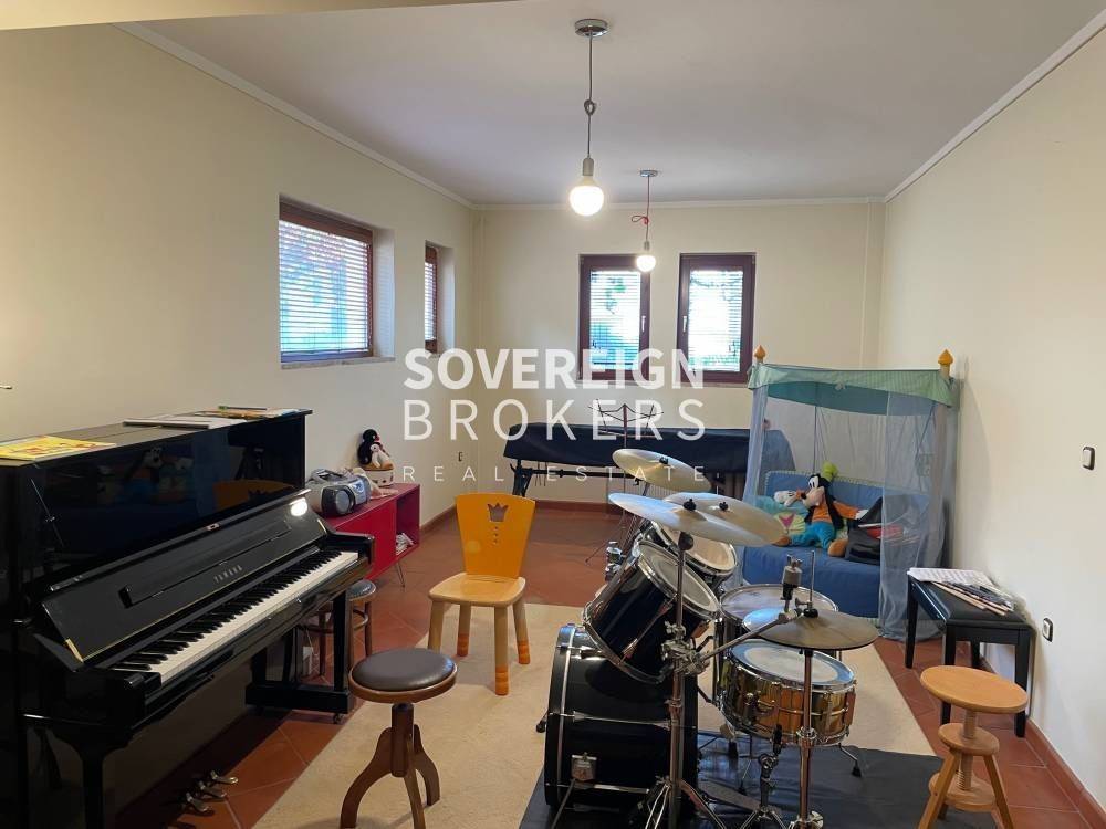 Στο ισόγειο υπάρχει ένα επιπλέον άνετο σαλόνι με τζάκι, μία μεγάλη κουζίνα, 2 ακόμη δωμάτια και 1 μπάνιο καθώς και ένας μεγάλος ενιαίος χώρος που μπορεί να διαμορφωθεί σε play room, γυμναστήριο ή οτιδήποτε άλλο σύμφωνα με τις ανάγκες σας. Υπάρχει επιπλέον και ο χώρος του λεβητοστασίου.