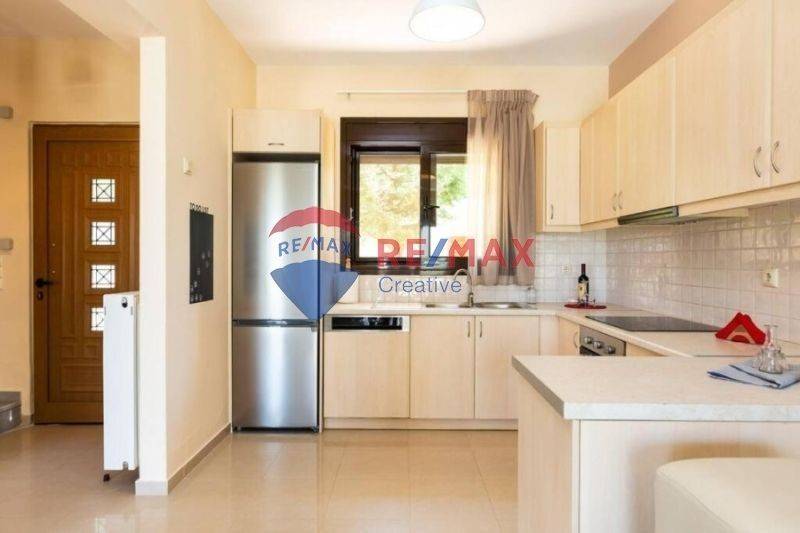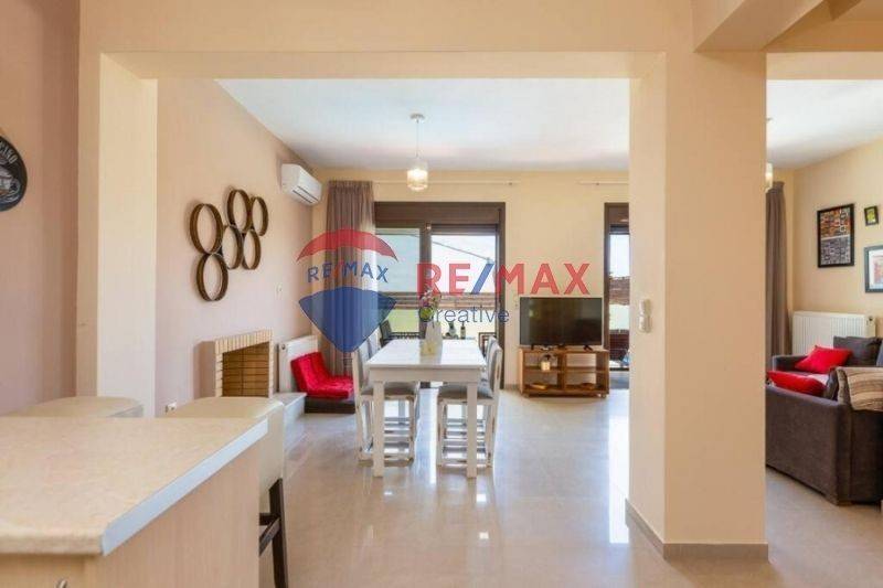 Στο ισόγειο συναντάμε έναν ευρύχωρο ενιαίο χώρο με σαλόνι, τραπεζαρία και πλήρως εξοπλισμένη κουζίνα, που συνθέτουν ένα ζεστό και λειτουργικό περιβάλλον. Η μεζονέτα διαθέτει τρία μεγάλα υπνοδωμάτια, ιδανικά για φιλοξενία οικογένειας ή επισκεπτών, καθώς και δύο άνετα μπάνια και ένα επιπλέον WC.