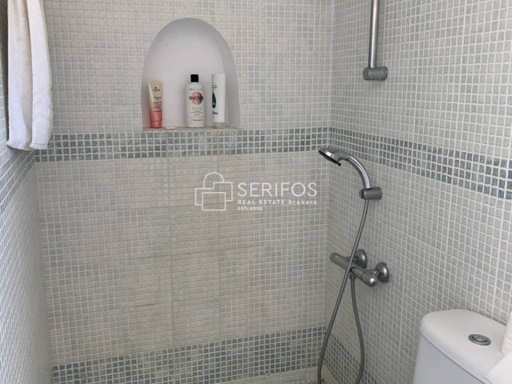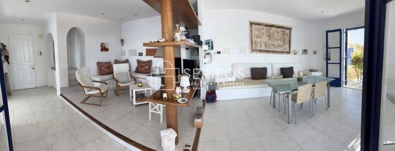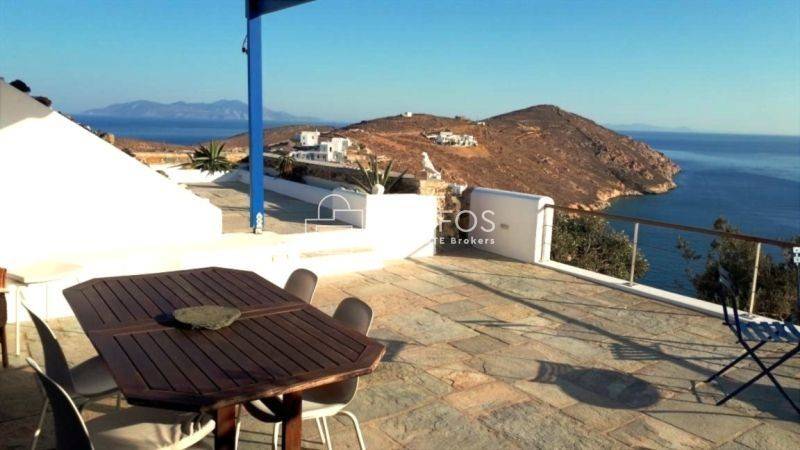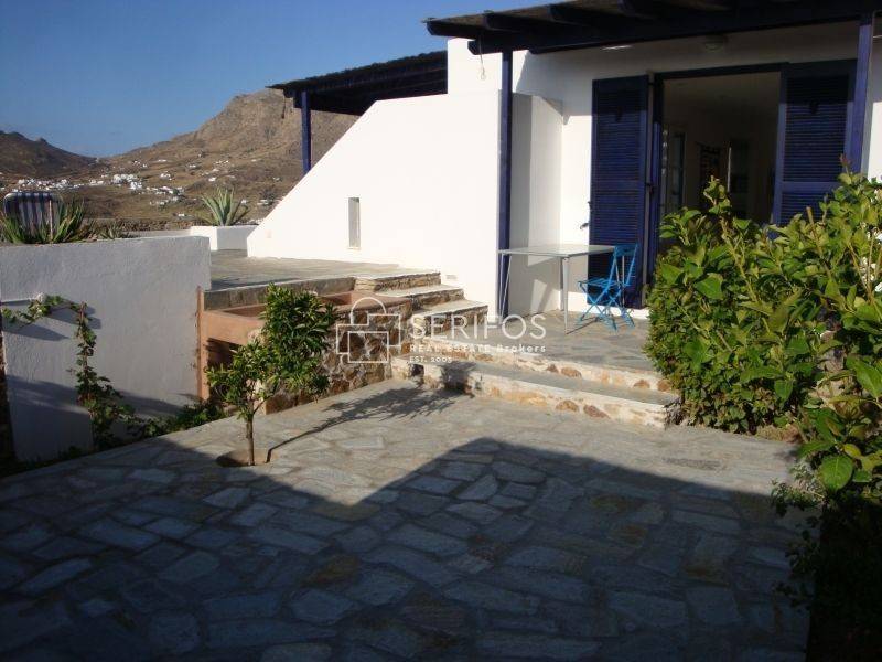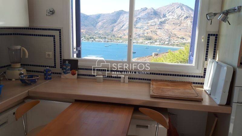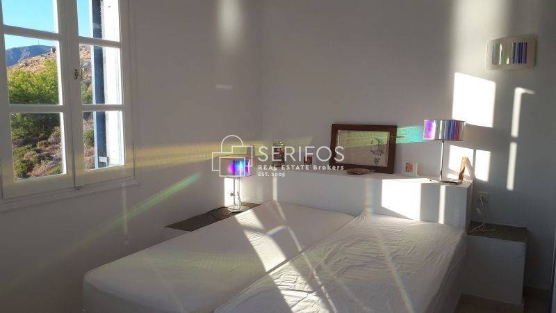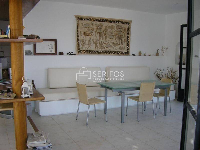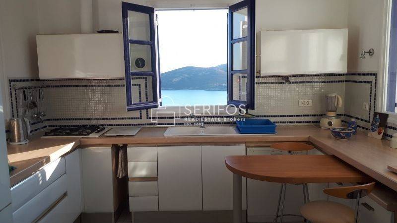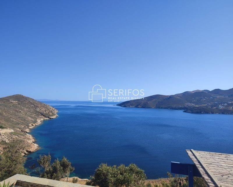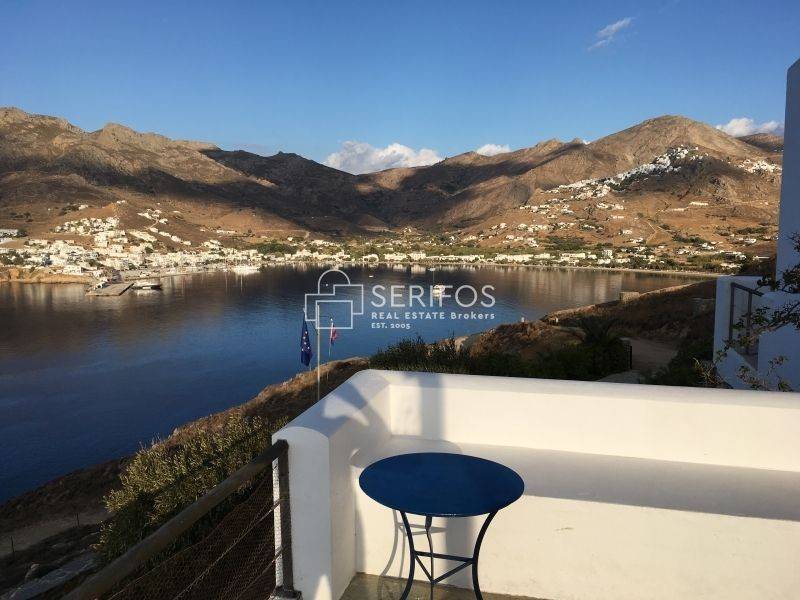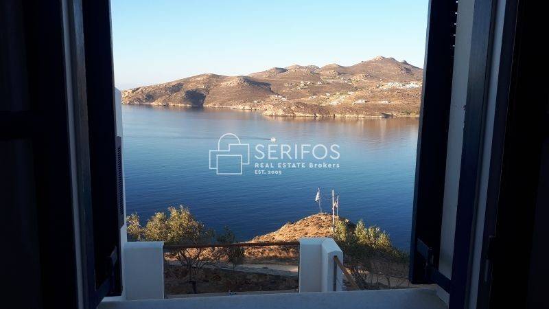 Χτισμένη σε ένα ακρωτήρι που δεσπόζει στον κόλπο της Σερίφου, αυτή η πετρόκτιστη και λευκή βίλα 120 τ.μ. προσφέρει εκπληκτική πανοραμική θέα. Η ευρύχωρη βεράντα της βλέπει από τη μία πλευρά το λιμάνι, από τη νότια πλευρά τη Μήλο και το ανοιχτό πέλαγος, ενώ προς τα ανατολικά αντικρίζει τη Σίφνο. Με δύο υπνοδωμάτια με διπλά κρεβάτια, κλιματισμό και ιδιωτικά μπάνια, καθώς και δύο επιπλέον μονά κρεβάτια με τουαλέτα και νιπτήρα, αυτό το ευρύχωρο και ιδιαίτερης αρχιτεκτονικής σπίτι μπορεί να φιλοξενήσει έως και 6 άτομα. Η κουζίνα, με άνοιγμα προς τρεις κατευθύνσεις, θυμίζει σταθμό παρατήρησης του λιμανιού. Η κλειστή εσωτερική αυλή με BBQ προσφέρει προστασία από όλους τους ανέμους, ενώ το οικόπεδο των 4.450 τ.μ. εγγυάται απόλυτη ιδιωτικότητα. Το γκαράζ μπορεί να μετατραπεί σε υπνοδωμάτιο και υπάρχει δυνατότητα για επιπλέον δόμηση 30 τ.μ. Πέρα από τη μοναδική της γοητεία, η τοποθεσία της κατοικίας είναι εξαιρετικά βολική: η σχεδόν ερημική παραλία κάτω από τον γκρεμό λειτουργεί σαν ιδιωτική πισίνα, ενώ η κεντρική παραλία του χωριού απέχει περίπου 5 λεπτά με τα πόδια.