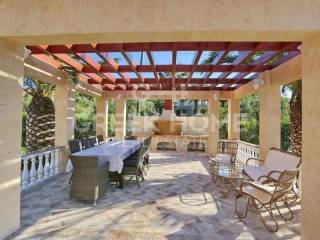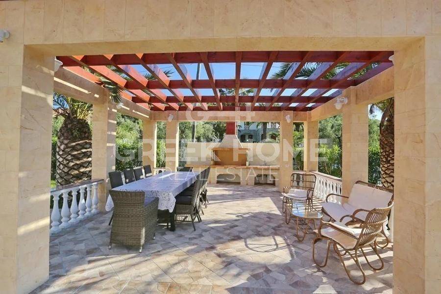 Pallini (Chalkidiki), Hanioti - Villa 350sqm plot 2100sqm, fully furnished, bedrooms 5, levels 3, excellent condition, year built 1900, energy class B+, 2 living rooms, hall, 2 kitchens, 5 bathrooms, 2 wc, heating type: autonomous (oil), air condition, parking, quiet, dual aspect apartment, luminous, sea view, frontage, storage space, solar heater, fireplace, balconies, garden, built in appliances, aluminum frames, double glazed windows, door screen, stone & marble floors, handicap ramp, separate kitchen, office, secure door, alarm, luxurious, swimming pool, internal staircase, barbeque, jacuzzi, playroom, guest house, satellite, pets allowed, close to sea (up to 20m).