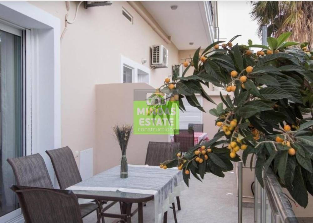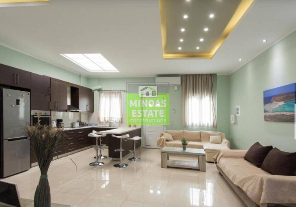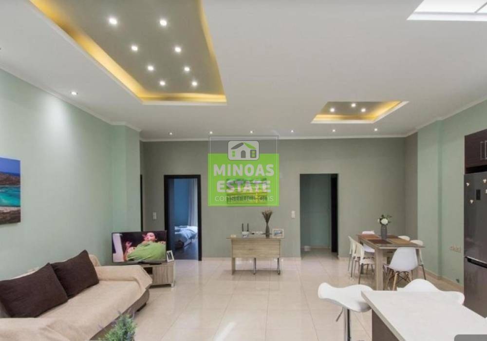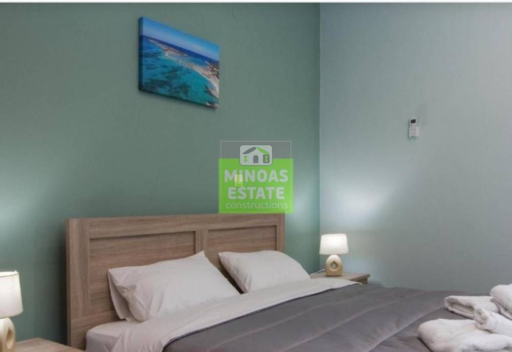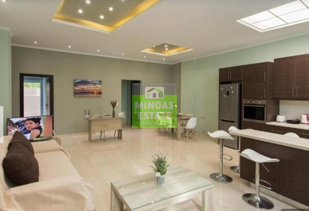 Souda, Center: Newly built airy, very bright Apartment for rent, 100 sq.m. in 700 sq.m. luxury plot, on the ground floor with individual heating (air conditioning). It consists of 2 bedrooms, 1 kitchen-living room, and a bathroom. It is fully furnished, equipped, with electrical appliances, built in 2022, painted and has aluminum frames with double glazing, security door, outside parking space, energy class A+, tiled floors, screens, solar water heater. It is ideal for cohabitation of students or workers or for a family. It is located in a central part of the area near schools, pharmacies, supermarkets, the sea. Price €800 (includes internet). )| Property Code: #E-200239