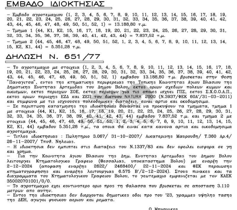 Πωλείται αγροτεμάχιο εμβαδού 5.351τ.μ. στον Άγιο Βλάσιο Πηλίου εκτός ΖΟΕ και άρτιο και οικοδομήσιμο.