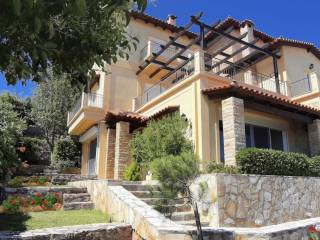 Frames are aluminium and fitted with double-glazed glass and nets, while some are equipped with electric shutters. In addition to the main house, there is also a 100 sqm basement with its own independent entrance. The three floors and basement are connected with an internal staircase and an elevator. There is an indoor parking space with electronic garage doors, and two open-air ones, while the plot is fenced and offers privacy and security. The landscaped gardens of the villa are tended with an automated irrigation system.