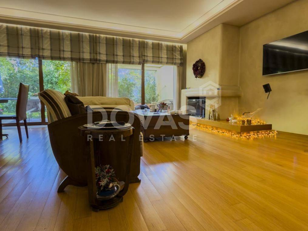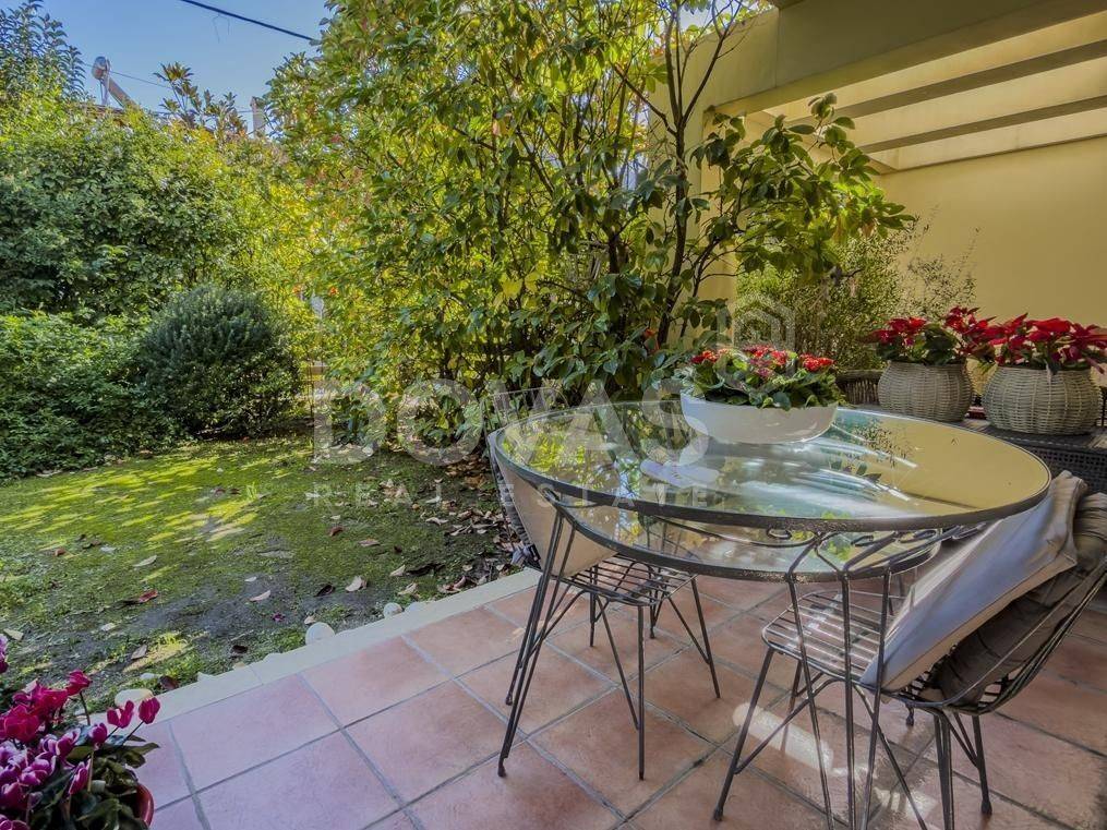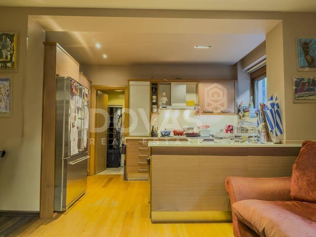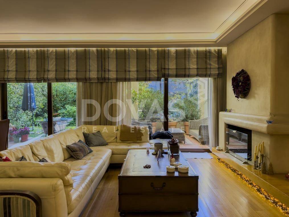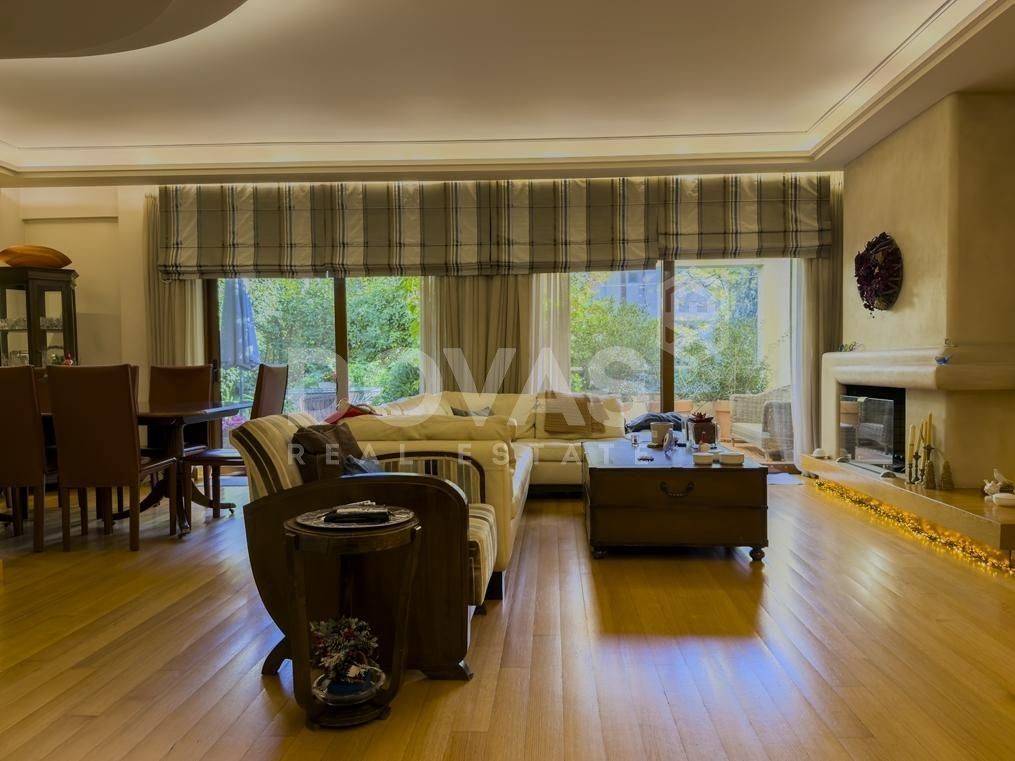 Kifissia, Nea Kifisia - Apartment 195sqm bedrooms 3, master bedroom, levels 2, semi-basement - ground floor, excellent condition, year built 2008, energy class C, living room, kitchen, 3 bathrooms, wc, heating type: autonomous (oil), parking covered, quiet, luminous, frontage, painted, storage space, boiler, fireplace, balconies, large balconies, garden, aluminum frames, double glazed windows, door screen, wood floors, handicap ramp, separate kitchen, three phase electricity, night electricity discount rate, secure door, alarm, video doorbell, luxurious, playroom, service room, laundry room, residential zone, eastern orientation.