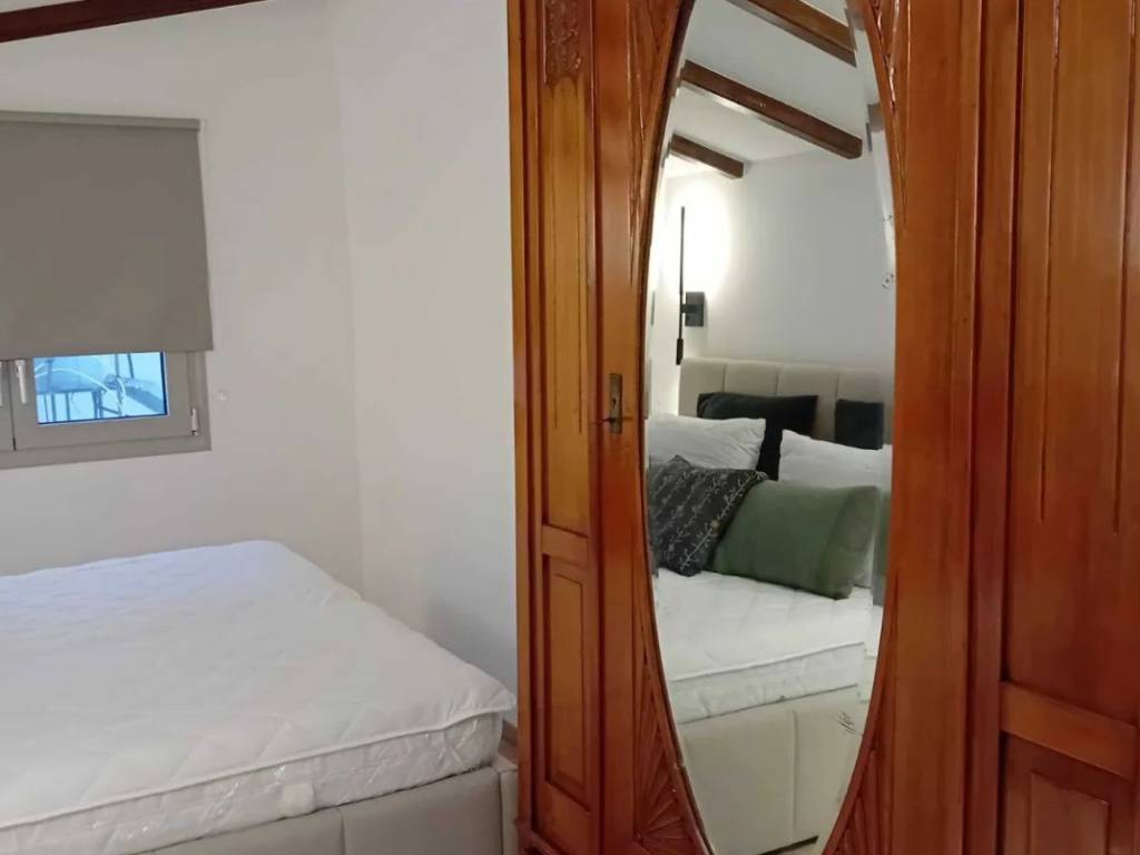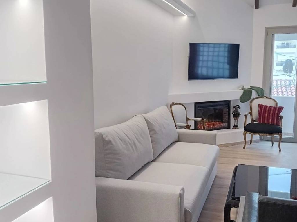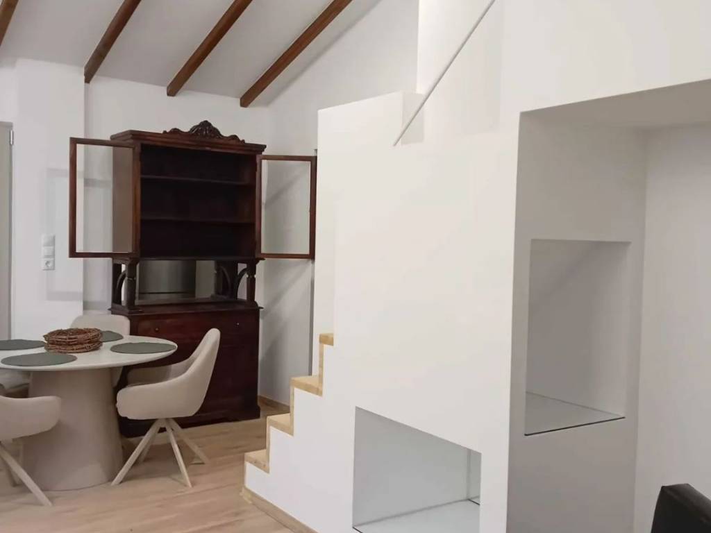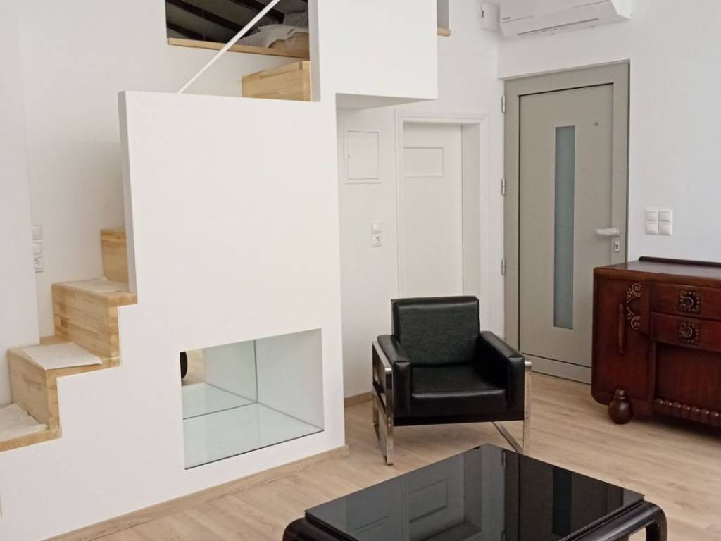 Fully renovated and tasteful 70 sq.m. penthouse apartment on the 2nd floor, furnished, with elegant aesthetics and selected vintage elements. It is front-facing and dual-aspect, close to the center. FIRST RENTAL. Equipped with a new built-in kitchen and modern NEW appliances, dishwasher / washing machine, new dining table, bed with mattress, air-conditioning units, solar water heater, energy-efficient window frames, security door, and electric fireplace. It also features a smart TV, bright open-plan space with high ceiling, separate office area with desk, loft with double mattress for guests, sofa bed, 2 wardrobes, storage walls, plasterboard constructions, and a large bathroom with built-in counter and bathtub. The building has undergone structural reinforcement and roof thermal insulation, and includes new plumbing and electrical installations, and new laminate flooring. With its own electricity meter. Suitable for a professional or a couple. Contact number 6972337800