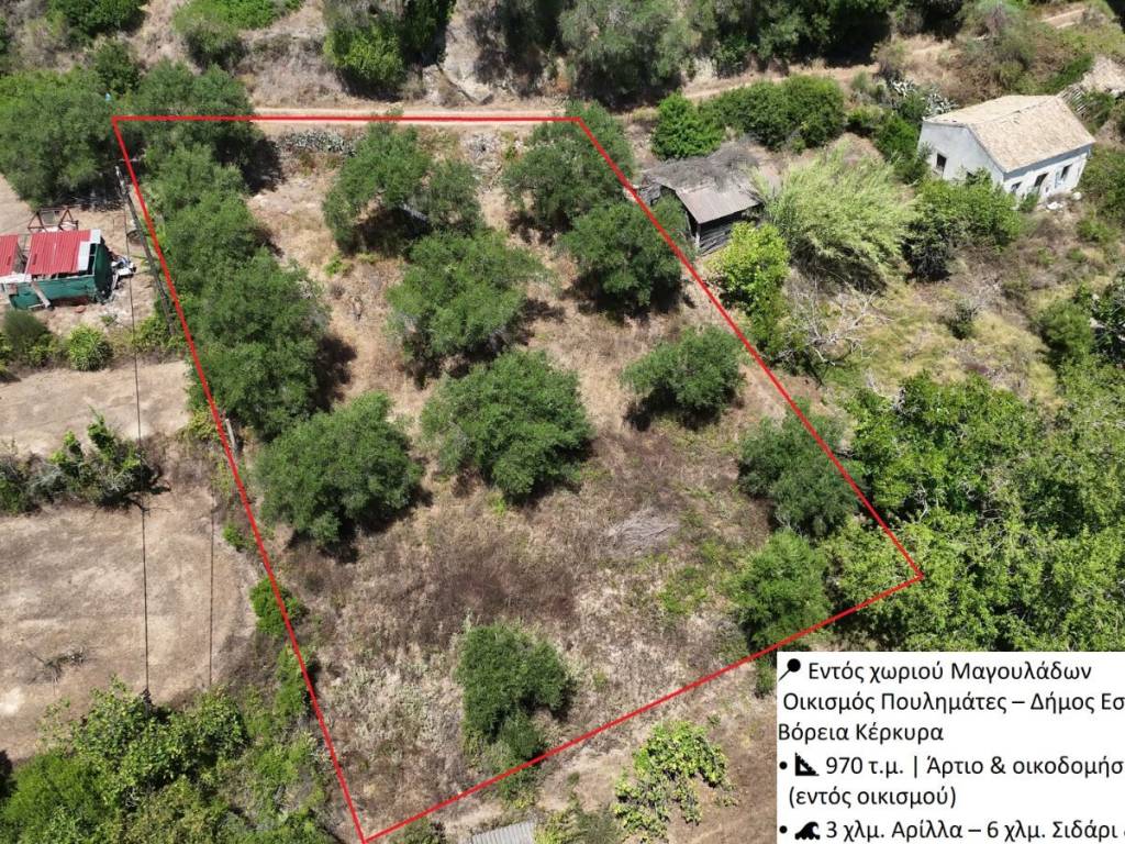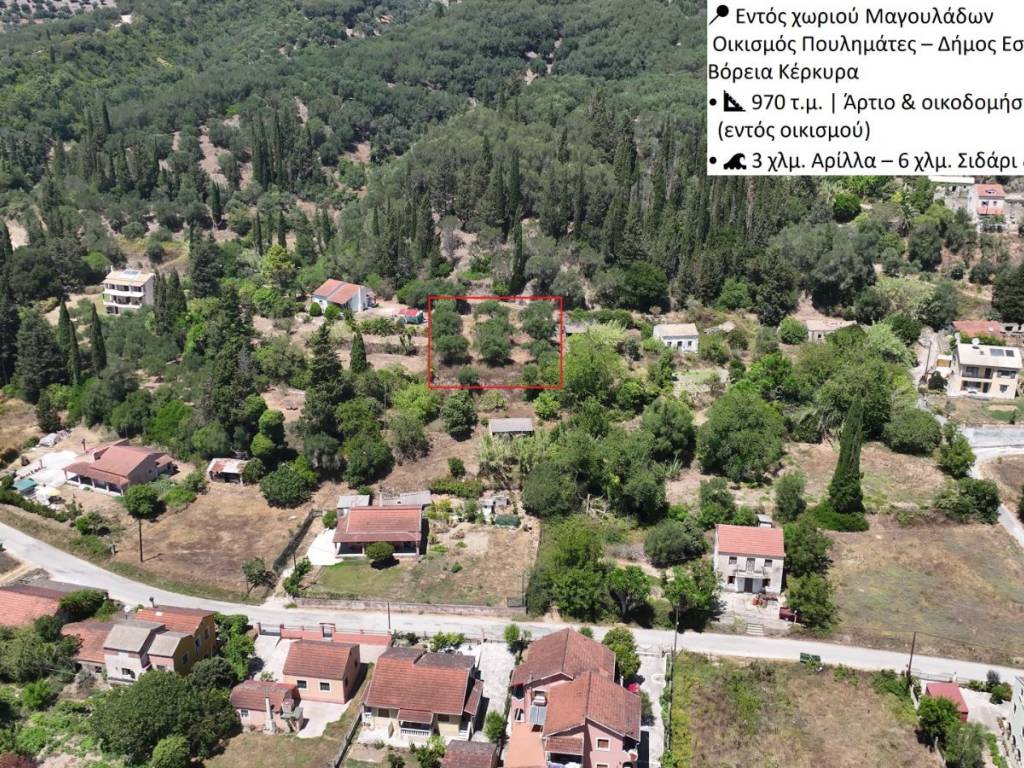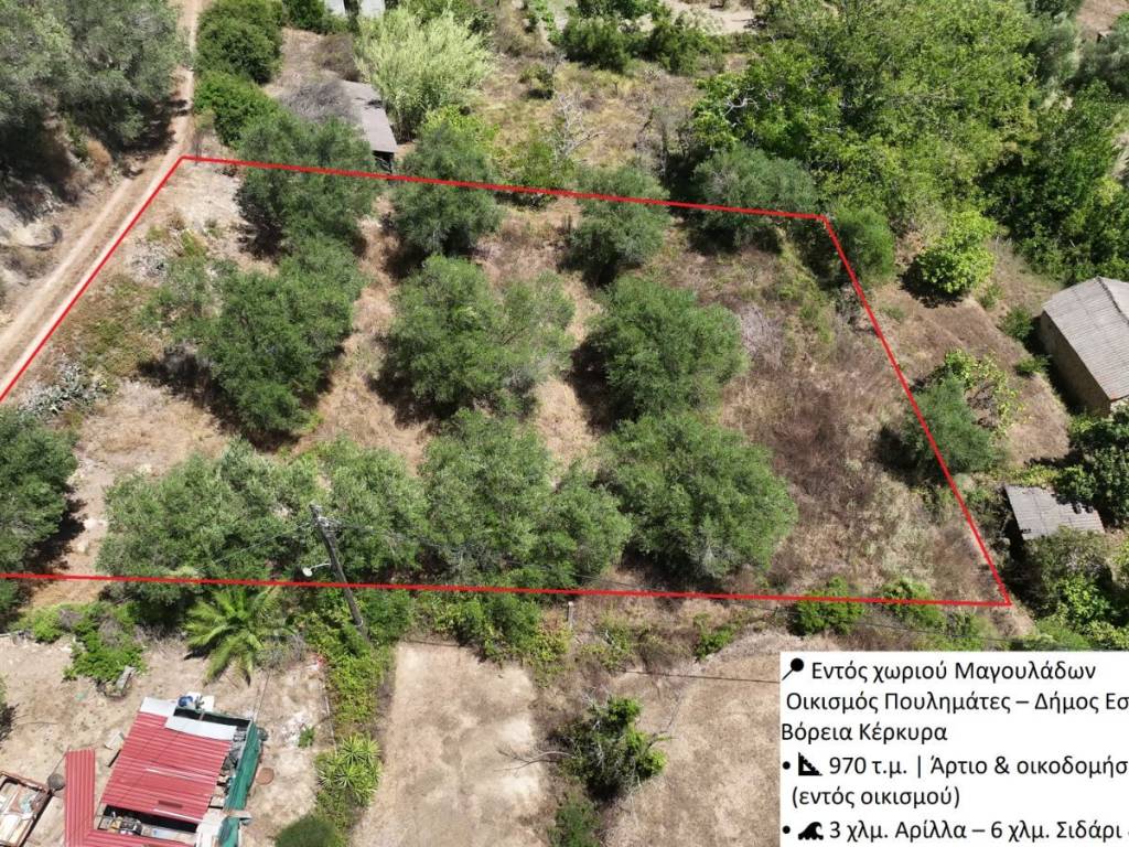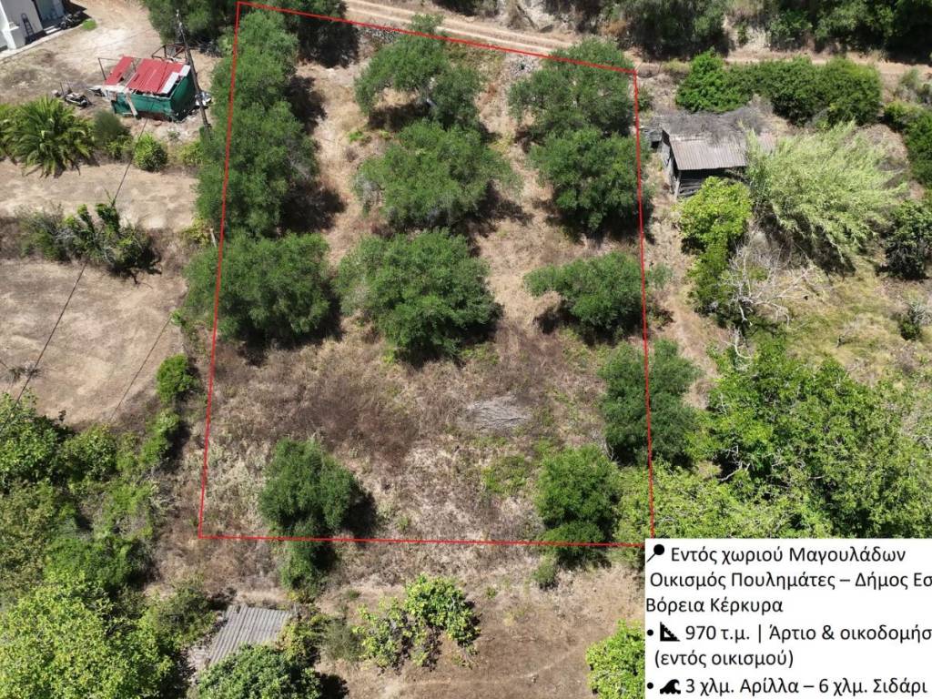 Σε έναν ήσυχο και καταπράσινο οικισμό της Βόρειας Κέρκυρας, στους Πουλημάτες του χωριού Μαγουλάδες (Δήμος Εσπερίων), διατίθεται προς πώληση άρτιο και οικοδομήσιμο οικόπεδο 970 τ.μ., εντός οικισμού. Το ακίνητο είναι επίπεδο με ελαφριές φυσικές κλίσεις, περιβάλλεται από ελαιόδεντρα και πλούσια βλάστηση, προσφέροντας απόλυτη αίσθηση ηρεμίας και ιδιωτικότητας, ενώ ταυτόχρονα βρίσκεται σε εξαιρετικά προνομιακή τοποθεσία. Απέχει μόλις 200 μέτρα από τον κεντρικό αυτοκινητόδρομο, 500 μέτρα από το χωριό των Μαγουλάδων, ενώ σε πολύ μικρή απόσταση βρίσκονται μερικές από τις πιο φημισμένες παραλίες της Κέρκυρας: • 3 χλμ. από την παραλία του Αρίλλα • 3 χλμ. από το Σιδάρι και το παγκοσμίως γνωστό «Canal d’Amour» Ιδανική επιλογή για: • κατασκευή μόνιμης ή εξοχικής κατοικίας • τουριστική εκμετάλλευση (βίλα, ενοικιαζόμενα) • επένδυση σε μία από τις πιο ανερχόμενες περιοχές της Βόρειας Κέρκυρας Συνδυάζει την αυθεντική κερκυραϊκή φύση με την άμεση πρόσβαση σε παραλίες, χωριά και βασικές υποδομές.