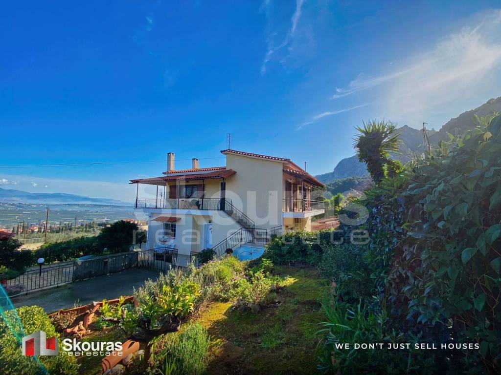 A detached house of 185 sq.m. is for sale on a 2,700 sq.m. plot in the area of Corinth – Xylokeriza, set in a lush green mountainous landscape, ideal for those seeking tranquility, privacy, and close contact with nature. The property is located in a quiet neighborhood and offers panoramic views of the Corinthian Gulf and the Saronic Gulf, as well as mountain and open-horizon views. The residence was built in 1990, is in good condition, and is developed over two levels. It features two bedrooms, two bathrooms, two WCs, two kitchens, and two living rooms, making it ideal both for a large family and for investment purposes. There is one outdoor parking space available. Heating is central oil heating, while the property also includes air conditioning and a solar water heater. It has aluminum window frames with double glazing and tiled floors. The house is fully furnished, bright, airy, sunny, and cross-ventilated. The outdoor area is particularly well maintained, featuring a garden, lawn, trees, verandas, and an inner courtyard, creating an ideal environment for relaxation surrounded by nature. Additional features include insect screens, awnings, storage room, security door, and internet connection. The property is located close to a school and supermarket, 8 km from the city of Corinth, 10 km from the sea, 8 km from the suburban railway, and 115 km from the airport. It is an excellent choice for a holiday home or an investment, combining unique views, natural surroundings, and high quality of life.