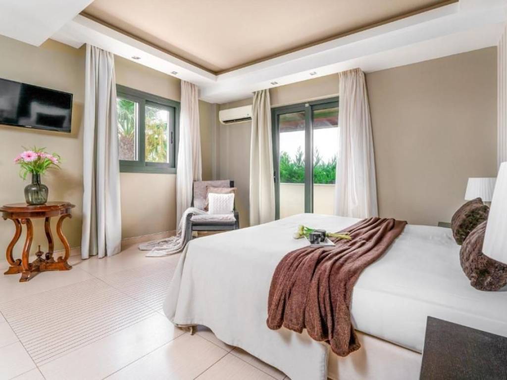 A luxurious three bedroom suite with modern and spacious rooms as well as sea view awaits you. The 160 sq.m suite is located on the first floor and offers luxurious facilities that will satisfy your every desire. It can accommodate up to 8 people and features 3 double beds, 2 bathrooms and two couches that convert to beds in the living room. Amongst the facilities there is a fully equipped kitchen and a comfortable living room. Price 720.000euro. The hot tub and fireplace are the standout features of this suite. Boasting a private entrance, this air-conditioned suite comes with 1 living room, 3 separate bedrooms and 2 bathrooms with a bath and a shower. In the kitchen, guests will find a stovetop, a refrigerator, kitchenware and an oven. The spacious suite features soundproof walls, a tea and coffee maker, a seating area as well as a terrace with sea views. The unit has 5 beds.
