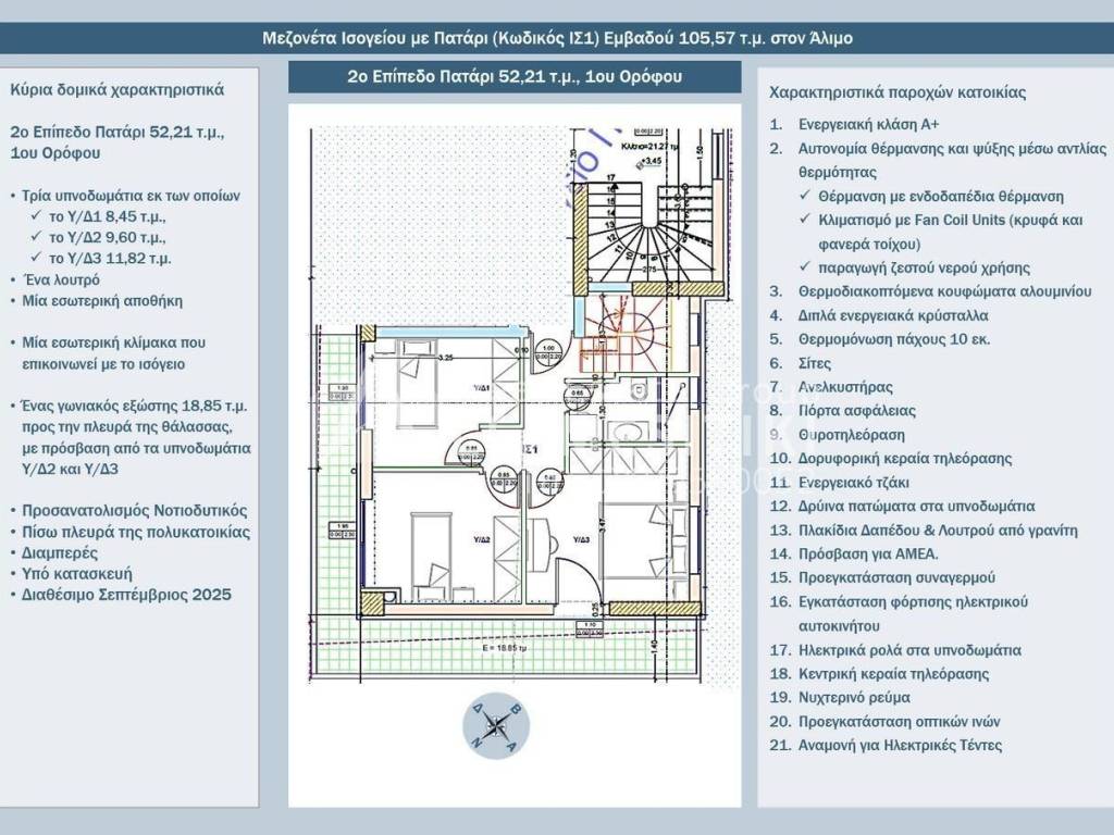 Luxury Under-Construction Maisonette of 105.57 sq.m. in Alimos This impressive maisonette of 105.57 sq.m., located in a luxurious six-story residential building in Alimos, combines high aesthetics, modern architecture, and energy efficiency, creating an ideal space for modern families and professionals. Layout The maisonette is developed over two levels:1st Level Apartment of 53.36 sq.m. Ground Floor A spacious open-plan living-dining-kitchen area of 39.36 sq.m. A WC An internal staircase leading to the 2nd level/1st floor Exclusive use of a garden of 141.73 sq.m., wrapping around three sides of the residence A swimming pool in the garden measuring 2.45m x 5.75m = 14.00 sq.m. 2nd Level Loft of 52.21 sq.m., 1st Floor Three bedrooms: Bedroom 1: 8.45 sq.m. Bedroom 2: 9.60 sq.m. Bedroom 3: 11.82 sq.m. One bathroom An internal storage space An internal staircase connecting to the ground floor A corner balcony of 18.85 sq.m. on the seaside, accessible from Bedrooms 2 and 3 Additional Features Parking space No. 2 on the ground floor, 10.35 sq.m. Storage room No. 4 in the basement, 8.96 sq.m. Technical features and amenities The residence is equipped with the most modern technologies and materials: Energy Class A+ with 10 cm thermal insulation Autonomous heating and cooling via heat pump: Underfloor heating Air conditioning with concealed and wall-mounted Fan Coil Units Hot water production Aluminum thermal break frames and double-glazed energy windows Energy fireplace Wooden floors in bedrooms and granite tiles in bathrooms and other areas Pre-installed alarm system Electric vehicle charging station Elevator and wheelchair accessibility Security door, intercom, and satellite TV antenna Location and Advantages of Living in Alimos Located in a quiet neighborhood of Alimos, close to main roads and the coastal avenue, it offers: Easy access to the center of Athens, Piraeus, and the Athenian Riviera. Excellent infrastructure, schools, shops, and recreational areas. Proximity to the iconic urban redevelopment project of the former Ellinikon Airport, significantly enhancing the area's value. This maisonette is an excellent choice for those seeking a luxurious, comfortable, and modern home in a strategically located area. ► For more details about the property, the building or the area as well as to visit the property you can visit the page - https://www.alfamesitiki.gr/pdetails?id=Α-146269&lng=en ► For opportunities in similar properties and in other areas visit our page at alfamesitiki.gr ► Last update 23/1/2026 ► Follow us on Facebook www.facebook.com/alfamesitiki.gr