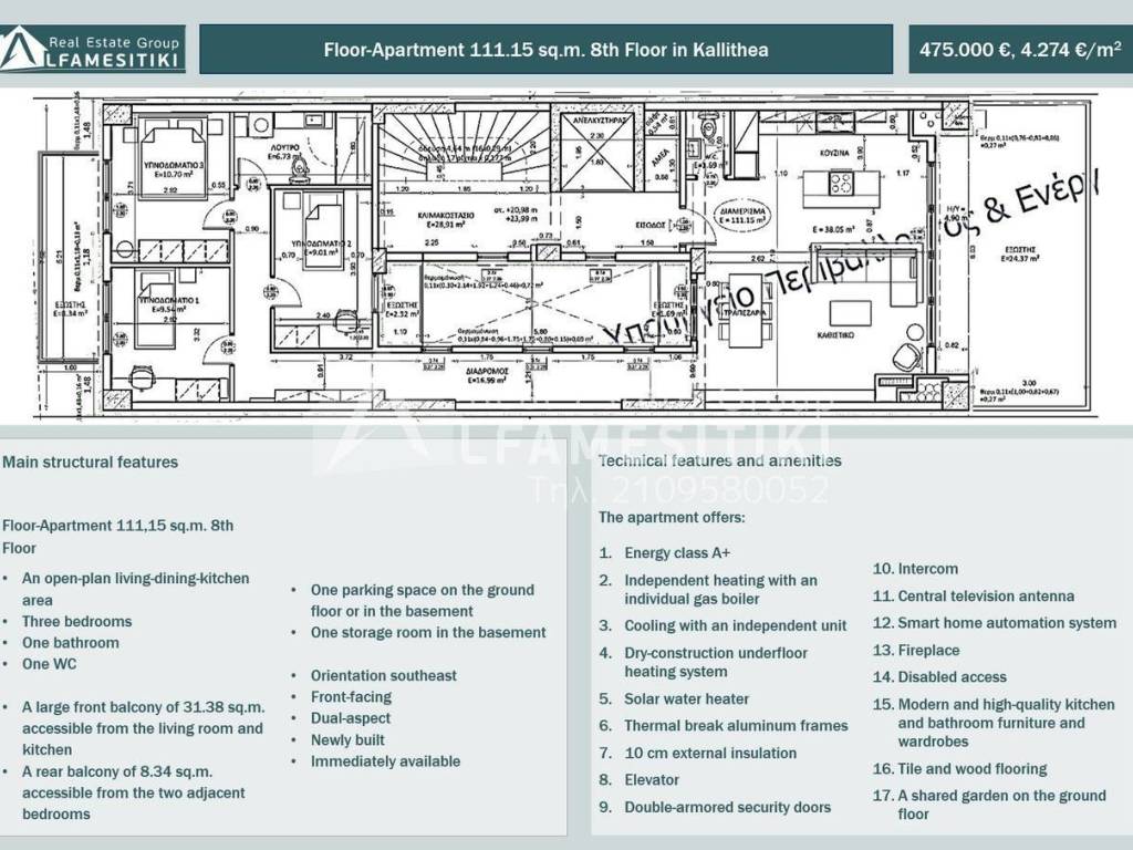 For sale: newly constructed floor-apartment, 111.15 sq.m., on the 8th floor of a luxurious eight-story residential building in Kallithea. Space Layout The apartment is front-facing, dual-aspect, airy, and sunny, with a southeast orientation. It includes a particularly spacious open-plan living-dining-kitchen area, three bedrooms, one bathroom, one WC, a large front balcony of 31.38 sq.m. accessible from the living room and kitchen, a rear balcony of 8.34 sq.m. accessible from the two adjacent bedrooms, one parking space, and one storage room in the basement. Technical features and amenities The apartment offers: energy class A+, independent heating with an individual gas boiler, cooling with an independent unit, dry-construction underfloor heating system, solar water heater, thermal break aluminum frames, 10 cm external insulation, elevator, double-armored security doors, intercom, central television antenna, smart home automation system, fireplace, disabled access, modern and high-quality kitchen and bathroom furniture and wardrobes, tile and wood flooring, and a shared garden on the ground floor. The construction is luxurious and aesthetically pleasing both externally and internally. It is characterized by its minimalist design, with attention to achieving optimal space utilization, functionality, views, and orientation. Location The residence is located in a quiet area in the center of Kallithea, offering an ideal location that combines the tranquility of home life with proximity to the vibrant city center, access to major roads, and public transportation, making it an ideal choice for families and active individuals alike. ► For more details about the property, the building or the area as well as to visit the property you can visit the page - https://www.alfamesitiki.gr/pdetails?id=Α-146245&lng=en ► For opportunities in similar properties and in other areas visit our page at alfamesitiki.gr ► Last update 20/1/2026 ► Follow us on Facebook www.facebook.com/alfamesitiki.gr
