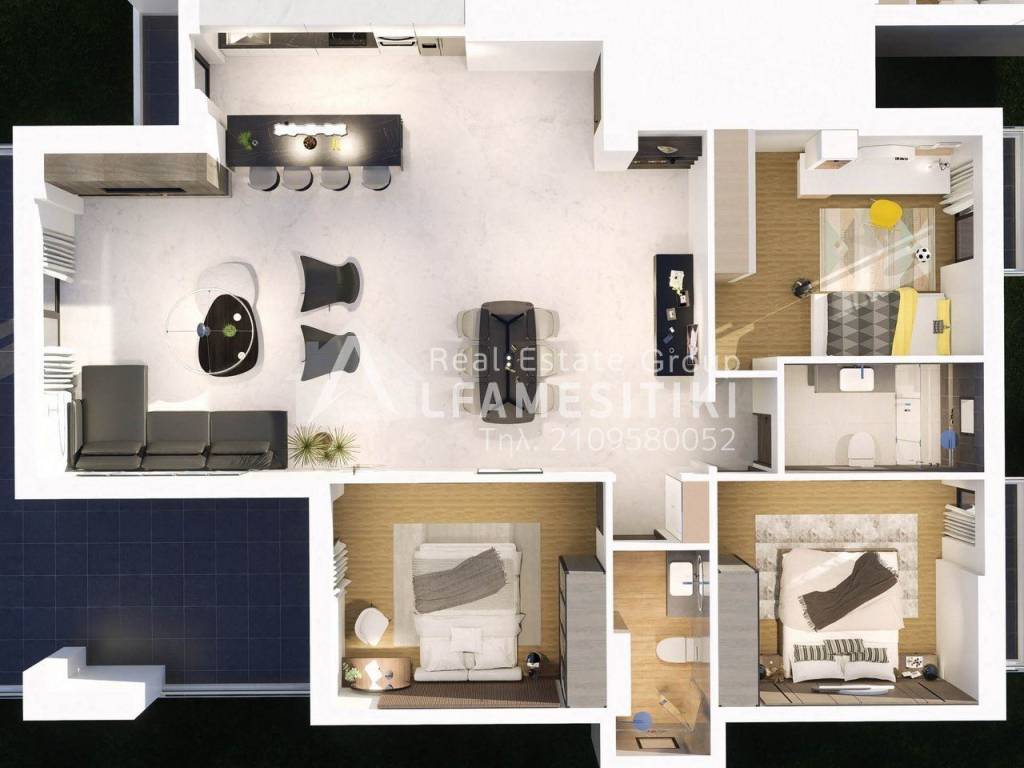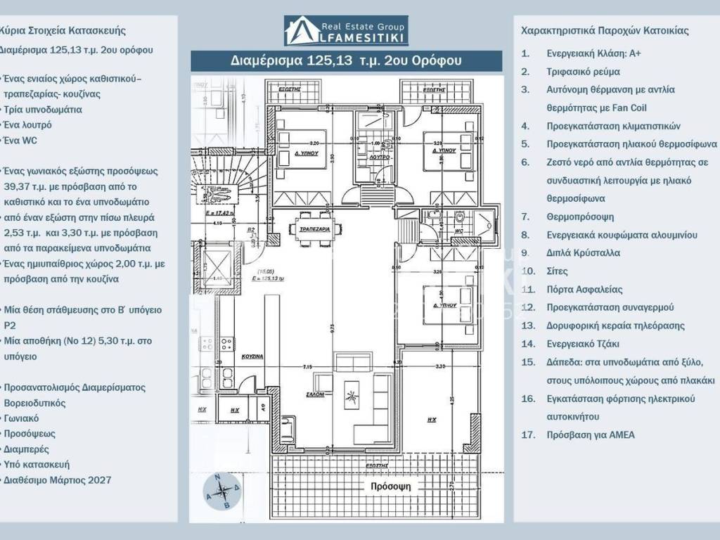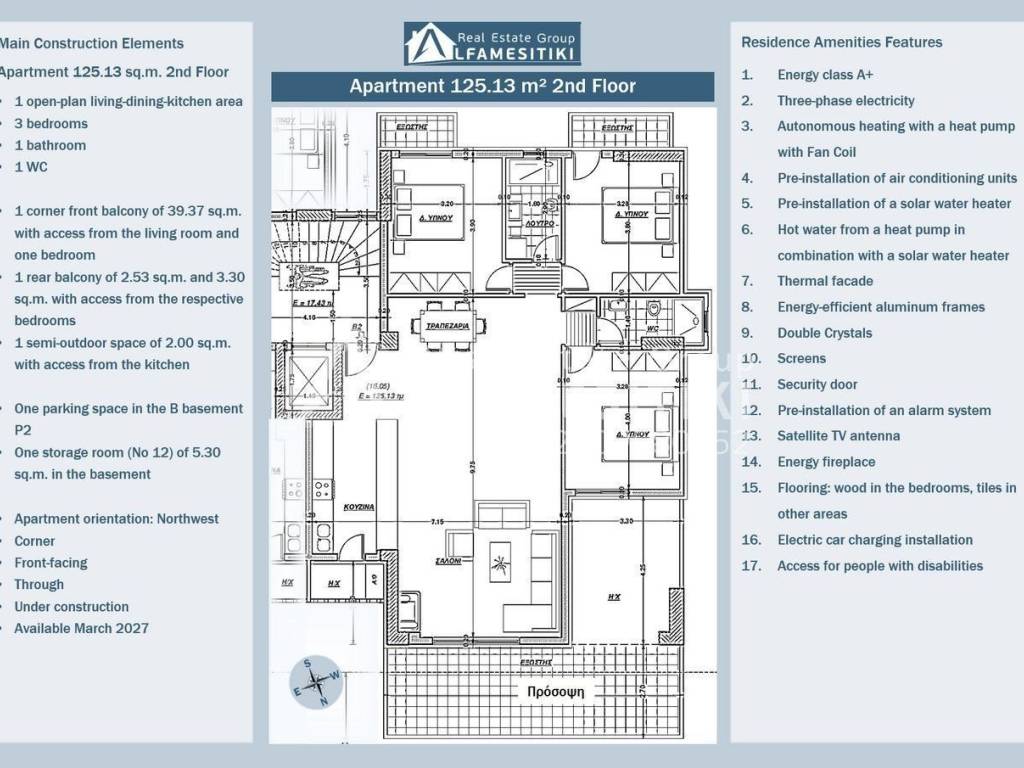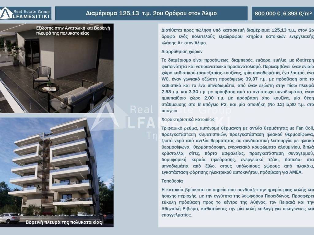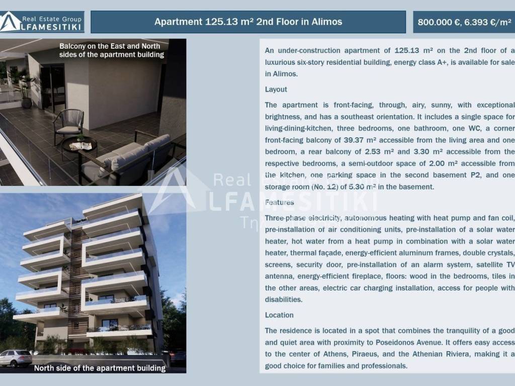 An under-construction apartment of 125.13 m² on the 2nd floor of a luxurious six-story residential building, energy class A+, is available for sale in Alimos. Layout The apartment is front-facing, through, airy, sunny, with exceptional brightness, and has a southeast orientation. It includes a single space for living-dining-kitchen, three bedrooms, one bathroom, one WC, a corner front-facing balcony of 39.37 m² accessible from the living area and one bedroom, a rear balcony of 2.53 m² and 3.30 m² accessible from the respective bedrooms, a semi-outdoor space of 2.00 m² accessible from the kitchen, one parking space in the second basement P2, and one storage room (No. 12) of 5.30 m² in the basement. Features Three-phase electricity, autonomous heating with heat pump and fan coil, pre-installation of air conditioning units, pre-installation of a solar water heater, hot water from a heat pump in combination with a solar water heater, thermal façade, energy-efficient aluminum frames, double crystals, screens, security door, pre-installation of an alarm system, satellite TV antenna, energy-efficient fireplace, floors: wood in the bedrooms, tiles in the other areas, electric car charging installation, access for people with disabilities. Location The residence is located in a spot that combines the tranquility of a good and quiet area with proximity to Poseidonos Avenue. It offers easy access to the center of Athens, Piraeus, and the Athenian Riviera, making it a good choice for families and professionals. ► For more details about the property, the building or the area as well as to visit the property you can visit the page - https://www.alfamesitiki.gr/pdetails?id=Α-146233&lng=en ► For opportunities in similar properties and in other areas visit our page at alfamesitiki.gr ► Last update 22/1/2026 ► Follow us on Facebook www.facebook.com/alfamesitiki.gr