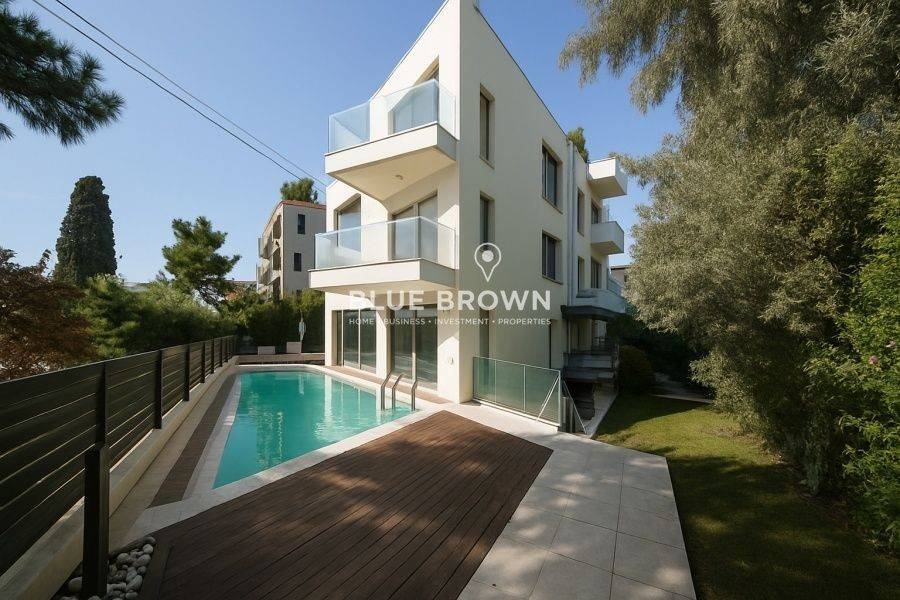 In the prestigious Athenian Riviera, in the area of Alimos, a luxurious detached residence is available for sale. The property offers a total living area of 376 sq.m. set on a 434 sq.m. plot. It is a rare find in a neighborhood dominated by apartment buildings, making it a unique and highly desirable choice for those seeking privacy, comfort, and an exceptional quality of living. The residence is developed across four levels and has been designed with a strong emphasis on natural light and the seamless flow between indoor and outdoor spaces. The ground floor impresses with its bright reception area that opens effortlessly to the outdoor space and private swimming pool, creating an atmosphere of complete relaxation and embodying the essence of indoor-outdoor living. The central Italian entrance door and the impressive internal staircase serve as architectural highlights, adding continuity and elegance to all floors. Large floor-to-ceiling windows and wide openings allow abundant natural light to flood the interiors, while electric blinds provide shading where needed. High-quality Schuco frames enhance the property’s energy efficiency, while offering top-tier security and sound insulation. Three of the four levels feature independent kitchens, ensuring flexibility in the use of spaces and allowing for autonomous living arrangements. Additionally, a fully independent apartment with a bedroom, bathroom, and open-plan kitchen–living area is ideal for hosting guests, private use, or separate rental exploitation. The outdoor areas are beautifully landscaped with lawn, trees, and an automatic irrigation system. The property offers two entrances through the garden for convenient access, as well as an additional entrance through a secured garage gate, ensuring maximum privacy and safety. The residence is equipped with an elevator connecting all floors, along with numerous modern amenities such as fireplaces, air conditioning, a solar water heater, storage rooms, and triple-glazed windows. Boasting sea views, exceptional construction quality, and a prime location just 7.5 km from the center of Athens and near the port of Piraeus—close to schools, marinas, and public transportation—this home is an ideal choice for families and investors alike. The area is on a steady upward trajectory, with property values consistently rising, making this residence a secure and strategically sound investment. The property is energy class B.
