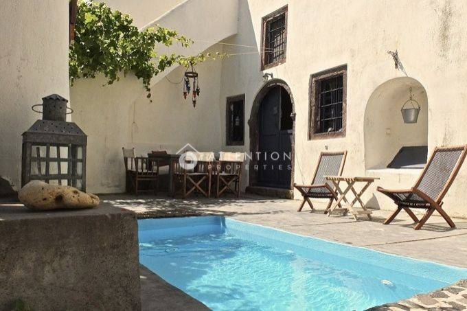 Santorini, Finikia, renovated villa complex for sale 236 sqm on a plot of 367 sqm with breathtaking sea view. A traditional winery cave house from 1810, renovated and transformed into an elegant villa complex of 3 independent apartments in walking distance to the famous Oia sunset, perfectly central located, but away from tourist crowd. Renovated in 2001 while keeping the traditional charm, kept in continuous maintenance, to be in perfect condition. The secured villa complex is composed of the main house, two independent guest houses, a warehouse of 13 sqm, an engine room. The main building: Partly caved construction (two interconnected parallel cave domed chambers) of 149 sqm with one kitchen, living/dining room, two bathrooms, two bedrooms, and one open loft. Guest house 2: Ground level 33 sqm with entrance from the main floor with one bedroom, en-suite bathroom, external kitchen and sizable terrace with sea view. Guest house 3 on the 1st floor: 41 sqm situated on the terrace of the main building containing one bedroom, kitchen, bathroom, its own terrace of 80 sqm with panoramic sea and sunset view. Connected to the garden by stairs. Independent entrance from the communal road on the upper side of the property. Pest nets, individual heating. Two facades, two entrances. Cozy swimming pool of 4,42 sqm and 1,5m depth, located in a protected yard surrounded by a stunning well kept garden. A 145 ccm water tank, very useful in Santorini, supplies additional water to the whole complex. The property is secured with a stone wall and created within a beautiful garden, little terraces for privacy in a peaceful atmosphere. Installed camera system for security. You can either operate it as a successful business with a licensed registered brand name and top reviews- all routine works are taken over by professional external associates, or you just enjoy this perfect home for yourself, family and friends. Please observe the attached video to get a better impression. Code: 114 ATTENTION PROPERTIES +30 2111989766 +30 6947126487 info@attentionproperties.gr YOUR DREAMS, MADE IN GREECE