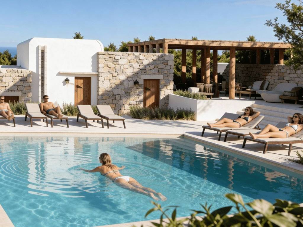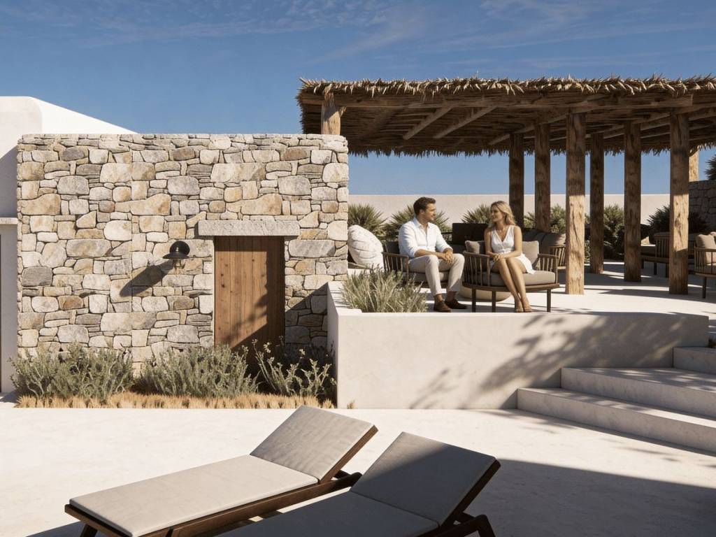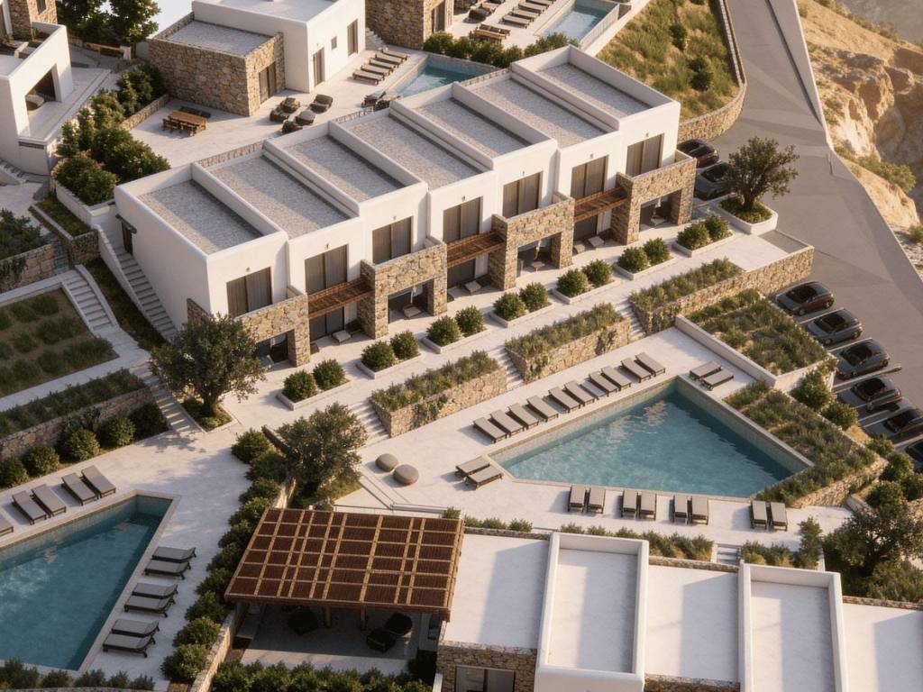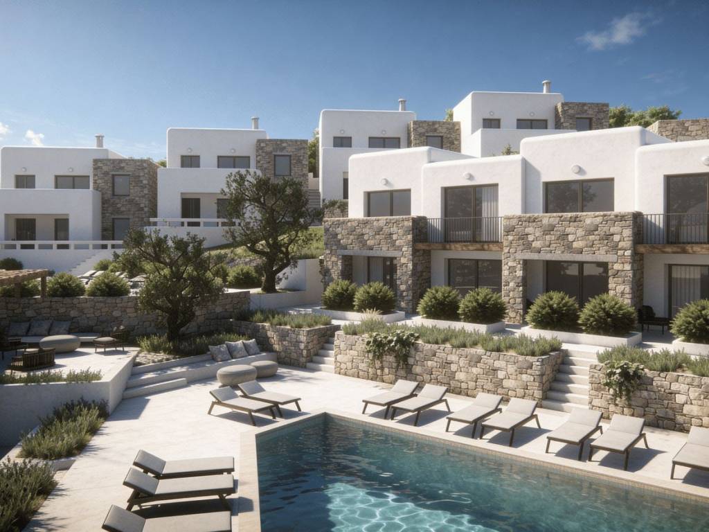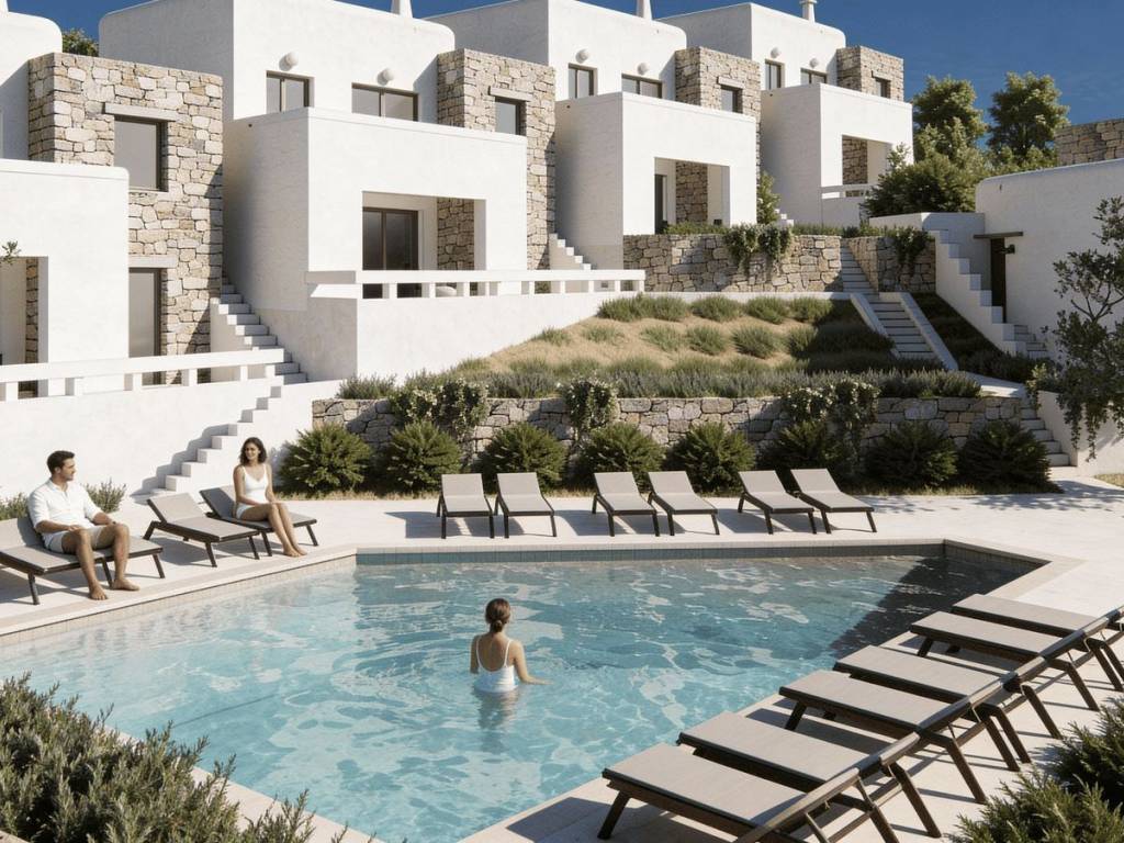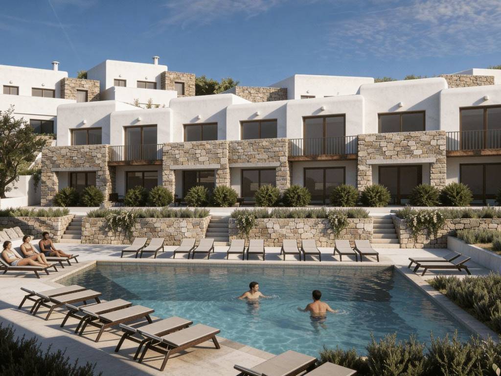 The complex offers a choice of 20 studios, each thoughtfully designed to provide comfort and functionality. Option 1 - Ground-floor studios: 13 studios, each offering 36 m² of living space on the ground floor, featuring a kitchenette, one bed and a sofa bed that can be converted into an additional sleeping space. Each studio includes a private terrace, perfect for enjoying breakfast in the morning sun or relaxing in the evening. Option 2 - Upper-floor studios: 7 studios, each offering 36 m² of living space on the first floor, featuring a kitchenette, one bed and a sofa bed that can be converted into an additional sleeping space. These studios include a private balcony with pleasant views, offering a calm and peaceful place to unwind.