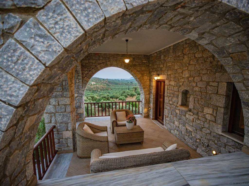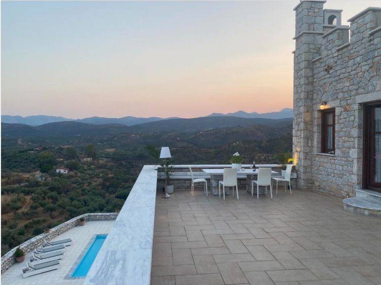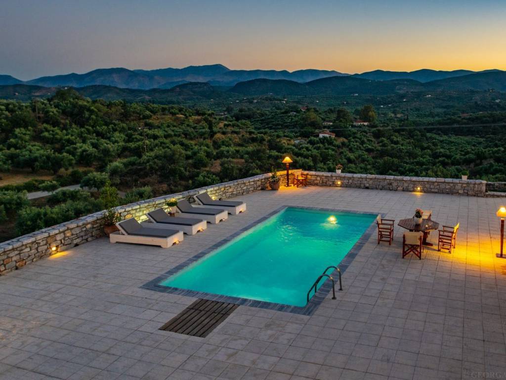 Gytheio – Agios Vasilios | For Sale A traditional stone-built villa of 420 sq.m. is offered for sale, set on a 1,200 sq.m. plot, constructed in 2008. The property has been built with stone in the traditional manner by local craftsmen, on a hill with unobstructed panoramic views of the Laconian Gulf and the Taygetos mountain range. It is surrounded by thousands of acres of olive groves. The villa is arranged over three levels, connected by an internal staircase, and consists of two living rooms with dining area, kitchen and fireplace, five bedrooms, three bathrooms, one WC, and a fully equipped kitchenette on the second floor. It also features a 4 x 8 meter swimming pool. The property is offered fully furnished and equipped. All areas are air-conditioned. Additionally, it is equipped with an alarm system, motion detectors, and smoke detectors. The location is 5 km from the town of Gytheio and the beautiful beaches of Mavrovouni and Petalea, while the snow-covered peaks of Mount Taygetos (during winter) are approximately 30 km away. ***The address provided is indicative of the property’s location and not the actual address.*** The real estate agency fee for residential and commercial leases amounts to one month’s rent plus VAT, while for property sales the agency fee is 2% plus VAT, with a minimum fee of €1,000 plus VAT. For property viewings, presentation of an ID card and tax identification number (AFM) is required in accordance with Law 4072/2012. The details of the listings are based on information provided to our company by the property owner. The company operates in accordance with Greek and European real estate brokerage legislation.
