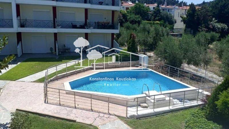 Maisonette with swimming pool in Kriopigi, Halkidiki. It has a green garden, a parking space, a view of the mountain and the sea. The house has a total area of ​​70 sq.m and consists of a single living room and kitchen area, two bedrooms, a bathroom and w/c. The living room area offers a large and comfortable sofa, TV cabinet, TV, coffee table and armchairs The kitchen is equipped with all electrical appliances, electric stove, refrigerator and washing machine. The bathroom is large and bright with a shower. Τhe first bedroom has a double bed with wardrobe. The second bedroom offers two single beds and a wardrobe. It has air conditioning, screens, a large balcony. Kriopigi is an ideal destination for family holidays. A place of incomparable beauty with its cobbled square, quaint taverns and small stone amphitheater, offering evenings of culture on your holiday.