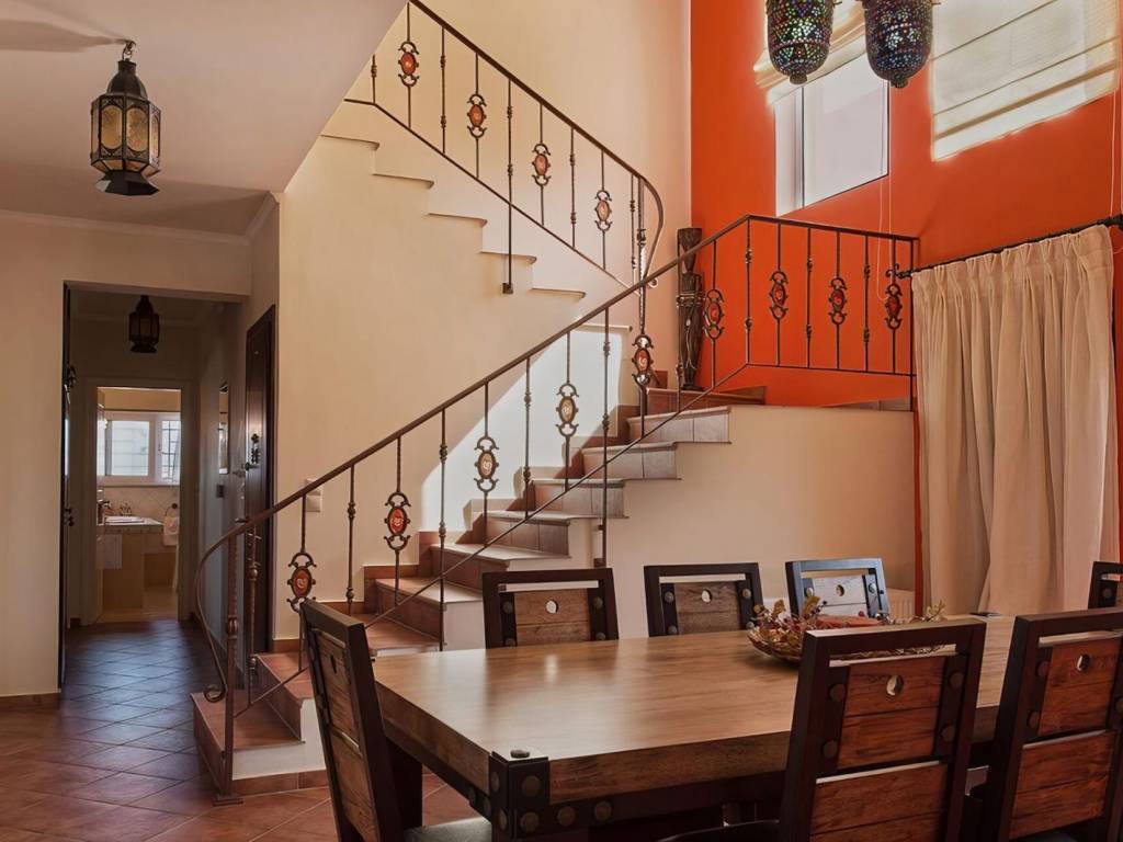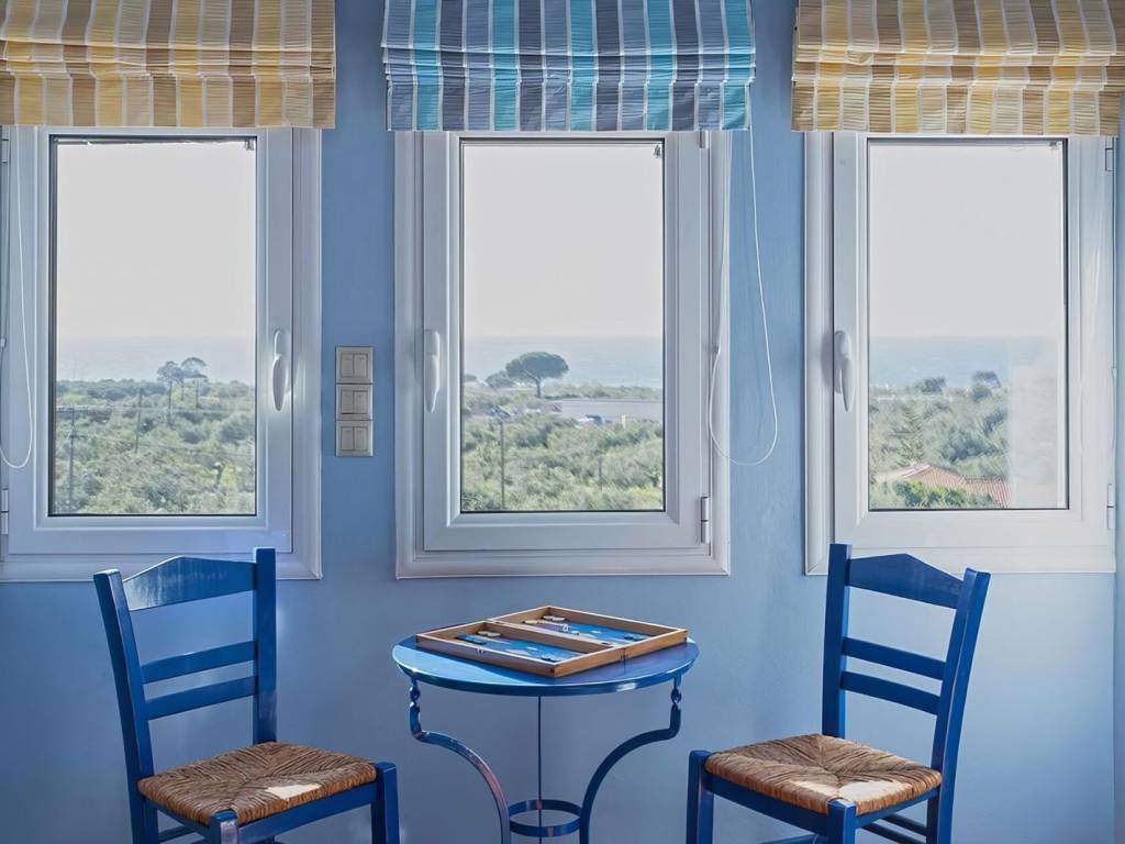 The first floor houses the bedrooms of the villa. The master bedroom has an en-suite bathroom, and another bathroom is on this floor. On the first floor, we also find an independent studio apartment with one bedroom, one bathroom and a kitchenette, complete with a security door, thus greatly enhancing the rental potential of the property. All the bedrooms open to spacious balconies with sea or mountain views. It should be noted that the main bathroom of the villa on its upper ground floor is fitted with a bathtub and hydromassage. All frames are double-glazed, aluminium, and fly nets, while those in the living/dining room are also fitted with electric shutters. The villa has central heating and a diesel boiler, while all bedrooms are air-conditioned.