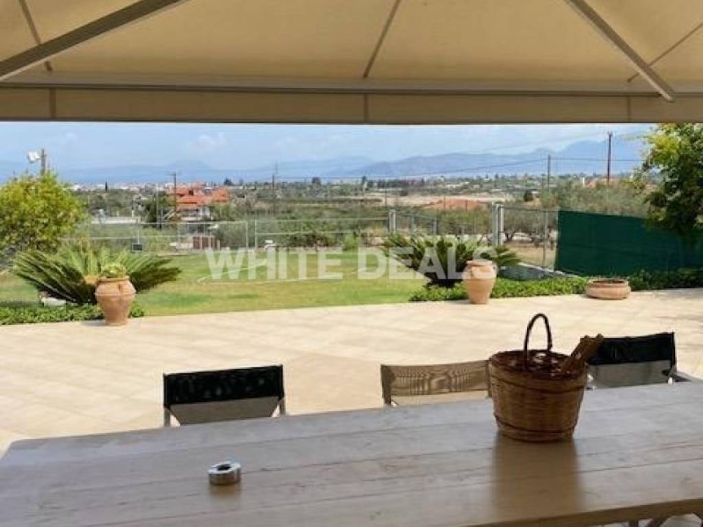 There is a landscaped Garden with lawn. And a large courtyard area of 80 square meters with tiles where there is a barbecue and one can enjoy a meal overlooking the Corinthian sea.