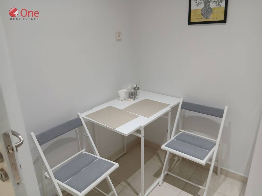 Step inside to find two cozy bedrooms, a welcoming living room, a functional kitchen, and a well-appointed bathroom. The apartment also features a handy storage room, adding to its practicality. From the windows, enjoy serene town views, perfectly complementing the fully furnished interior that boasts a combination of ceramic tiles and wood flooring.