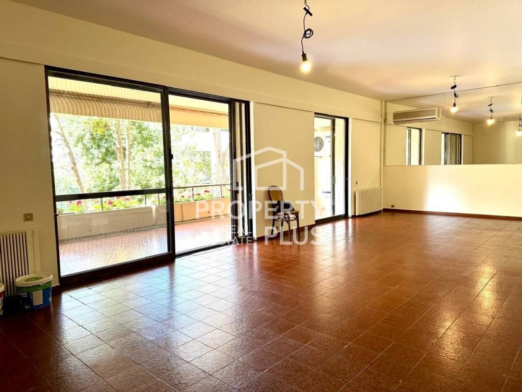 In a prime and highly convenient location in Filothei, near Petrino and Kifisias Avenue, in a six-apartment building constructed in 1974, a through (dual-aspect) apartment of 163.5 sq.m., located on the 1st floor. The property consists of a spacious reception area with a fireplace, a dining area, a large separate kitchen, 3 bedrooms—one of which is a master bedroom—2 bathrooms, and a staff room (or office or storage room) with its own WC and shower. The apartment features a large front veranda, a small balcony off the kitchen, and additional balconies at the rear serving the bedrooms. It includes aluminum window frames, wooden floors, central oil heating (serving two apartments, with the option to install an individual natural gas boiler), air conditioning, one exclusive-use pilotis parking space, and an additional parking space with agreed usage.