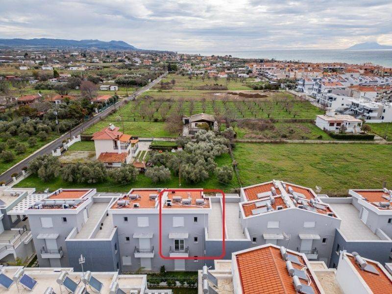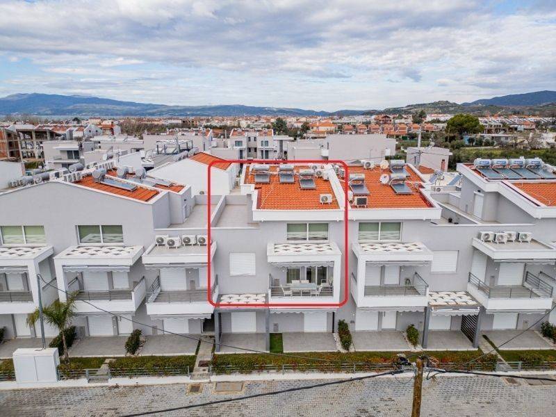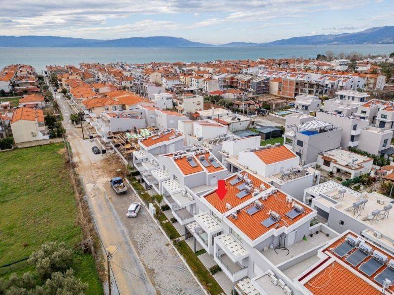 First floor apartment with attic for sale, with a total area of 63.51 sq.m., in the "NEFELI" complex in Ofrynio Beach, Kavala. The apartment is newly built and consists of a living room-kitchen, two bedrooms, two bathrooms, two balconies, and a large terrace on the roof. Additional features of the property include synthetic window frames, sieves, tiled floors, three air conditioners, and a solar water heater. The exterior of the property is landscaped with lawn, ornamental plants, and trees, which are serviced by an automatic watering system. It is located just 300 meters from the coastal road and the golden sandy beach of the area and is east-facing. The property is for sale fully furnished and with all the electrical appliances. It is an excellent choice that can offer comfort and beautiful moments of relaxation to the tenants in combination with the good investment location of the complex. Year of construction: 2023