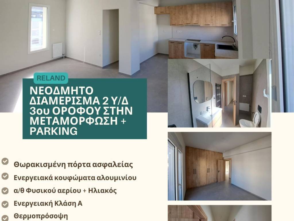 RELAND ✨ Brand new 3rd floor apartment for rent in Metamorfosi, Volos, including parking space! Modern, bright and energy-efficient property, ideal for couples or small families. Layout: ️ Open-plan living room & kitchen ️ 2 bedrooms Bathroom Balcony Parking space Features: Armored security door Energy-efficient aluminum frames Individual natural gas heating ☀️ Solar water heater ️ Thermal insulation (external facade) ⚡ Energy class A Bright & modern construction 3rd floor Located in a quiet and developing area of Metamorfosi, with easy access to shops and main roads. Price: 660€ / month Available immediately For more information or to schedule a viewing: RELAND Real Estate inforelandvolos@gmail.com +30 697 008 0280