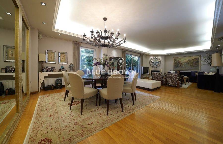 In the prestigious Efoplistika area of Voula, in a quiet and well-maintained neighborhood with beautiful residences and lush green surroundings, a luxury and fully independent maisonette of 360 sq.m. is offered for sale. The property is developed over three levels of 120 sq.m. each (basement, ground floor and first floor) and features a private garden of 285 sq.m., as well as a roof garden with a 10 sq.m. swimming pool and stunning views. The basement includes an independent apartment with a comfortable living–dining area with a fireplace, a large fully equipped kitchen, a bathroom, a bedroom/home office, a spacious storage room and a garage. The ground floor comprises a generous living room with a fireplace and a large veranda overlooking a green landscape, a separate kitchen, one bedroom and a guest WC. On the first floor there are four bedrooms, one of which is a master, along with an additional bathroom. An elevator serves all levels, offering maximum comfort and functionality. The residence features two parking spaces, aluminum window frames, parquet flooring, an internal staircase, a security door, alarm system, video intercom, insect screens, electrical appliances, air conditioning and autonomous oil heating. It is bright, airy, front-facing and in very good condition. The property also benefits from an external security post and stands out for its luxurious character and highly functional layout. It is a property of energy class C.