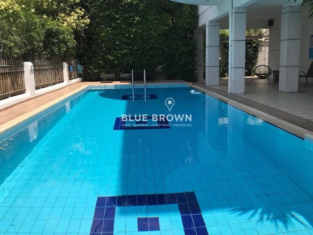 In the southern suburbs, in Kato Glyfada, a fully furnished first-floor apartment of 181 sq.m. is available for rent. The property was built in 2000 and offers access to a shared swimming pool. The apartment consists of three spacious bedrooms, one of which is a master bedroom, a study/office, two bathrooms, and one guest WC. It features a large living room with a fireplace, as well as a separate fully equipped kitchen with electrical appliances. Additional amenities include a closed parking space, storage room, security door, alarm system, and video intercom. The property is fitted with double-glazed windows and awnings. Heating is autonomous and provided via air conditioning. The apartment enjoys an excellent location, very close to Glyfada’s central market, the beach, and public transportation. The property has an energy efficiency rating of Class D.