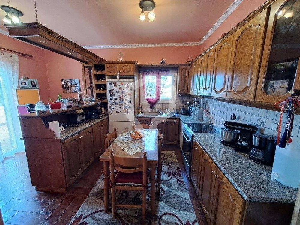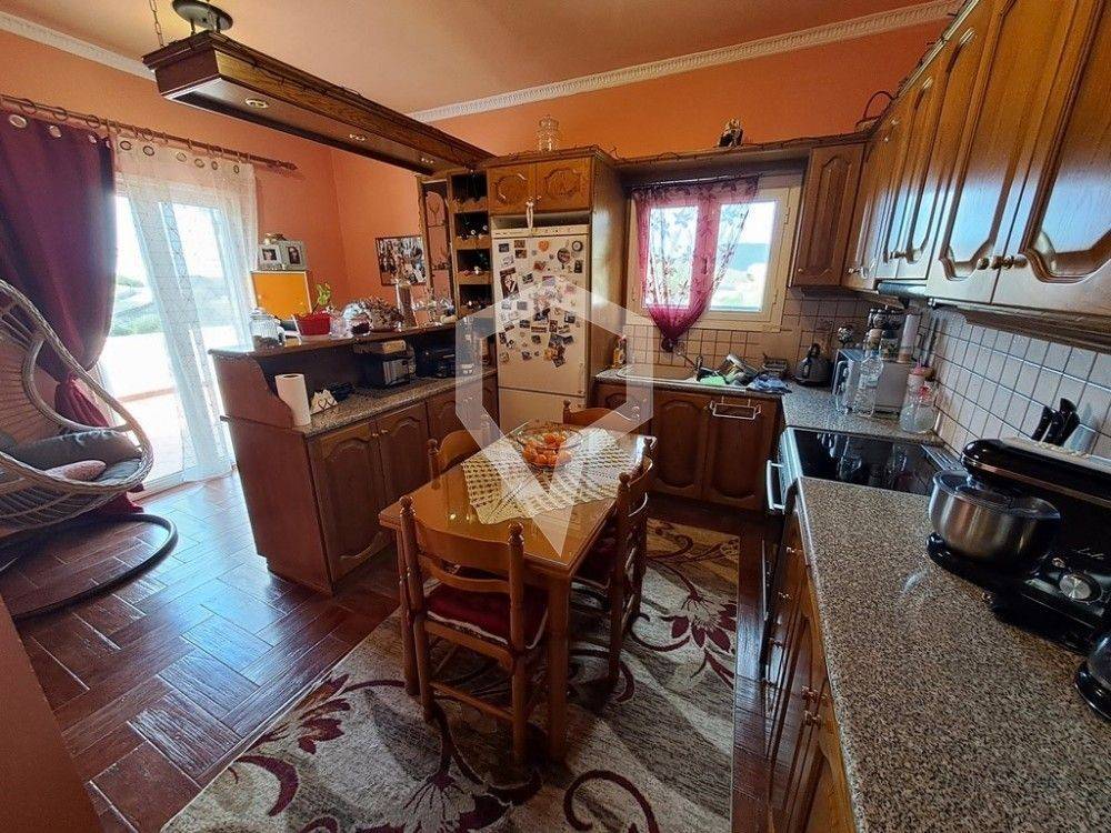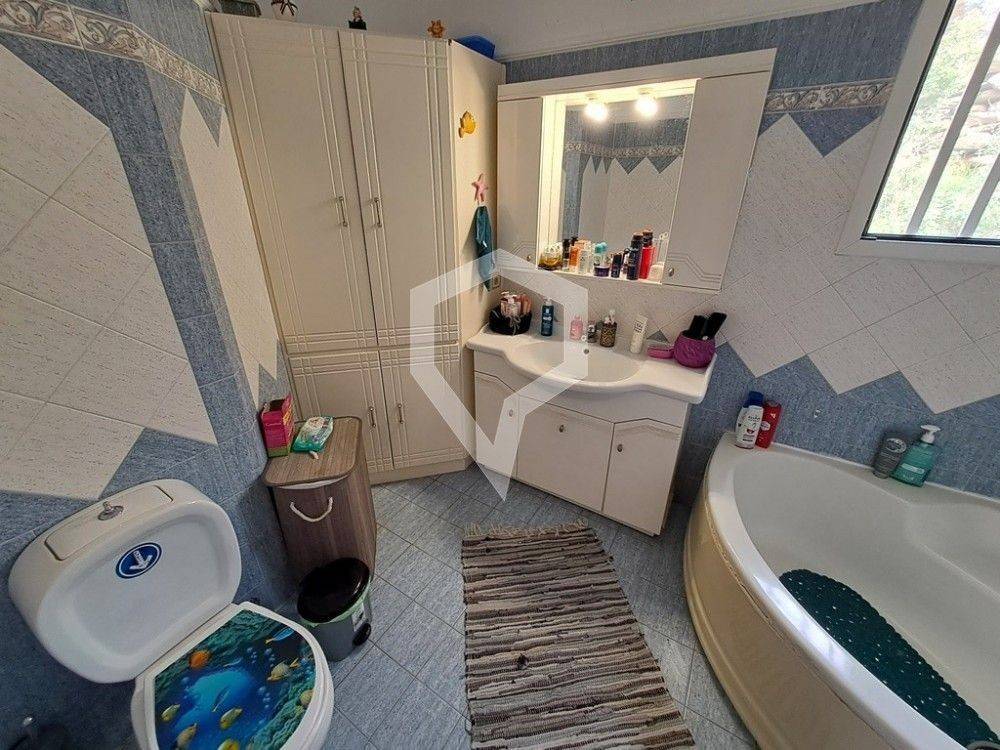 The first floor features a granite fireplace, three A/C units, three-phase power supply, provisions for radiator heating, two balconies, and a spacious veranda with unobstructed sea views and stunning sunsets.