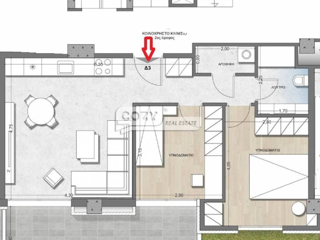 Thessaloniki, Thermi: In a complex of 2 independent buildings, For sale is a front-facing apartment of 72.05 sq m. on the 2nd floor. It consists of a living room with kitchen, 2 bedrooms, a bathroom and an internal storage room. Underfloor heating with individual natural gas. Energy class A+. It has a parking space and a storage room of 2.3 sq m in the attic.