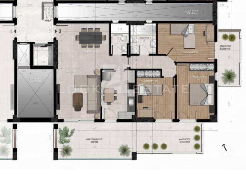 Pefki, Ano Pefki - Apartment 102sqm unfurnished, bedrooms 3, levels 1, 5th (102sqm), newly built, year built 2022, energy class A, living room, kitchen, 2 bathrooms, heating type: individual unit, heating medium electricity, air condition, parking covered, quiet, dual aspect apartment, luminous, corner, view unobstructed view, frontage, painted, storage space, solar heater, boiler, external thermal insulation, balconies, large balconies, elevator, frames thermal shut-off, double glazed windows, door screen, floor type wood, handicap ramp, night electricity discount rate, secure door, alarm, video doorbell, luxurious, ev charger, satellite, internet, pets allowed, residential zone, access from asphalt.