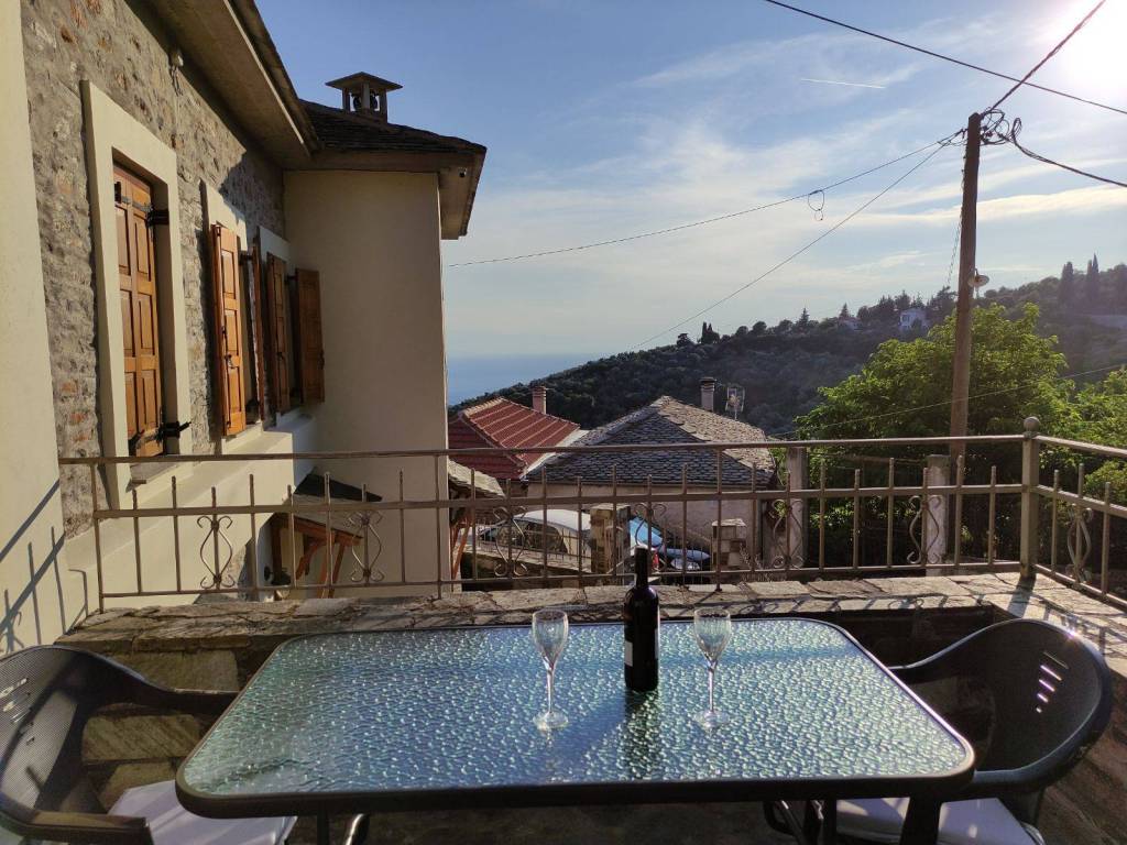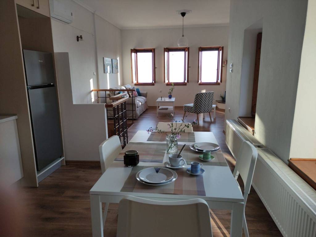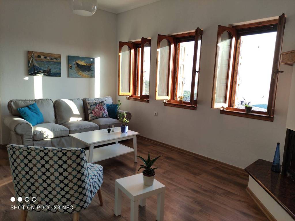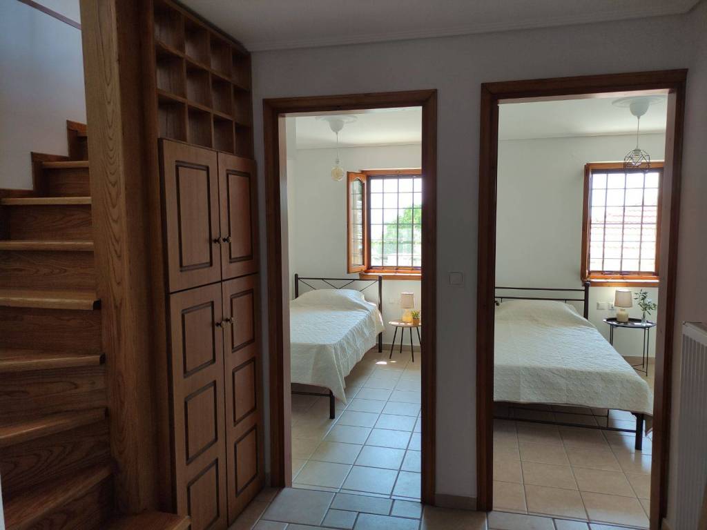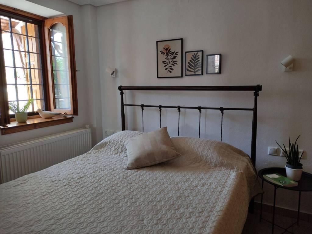 The house is a 120 sq.m. maisonette built with stone and wood. On the upper floor there is the kitchen, the living room and a W.C. On the lower floor there is a bathroom and three bedrooms. One bedroom features a large double bed, while the other two each have a comfortable single bed. In one of these rooms, an additional high-quality extra bed can be added, equipped with anatomical slats and a 12 cm mattress that ensures a comfortable sleep. The house is decorated in a modern, minimalist style that promotes calmness and relaxation. It is fully equipped and includes a washing machine, electric stove, refrigerator, 40-inch TV, air conditioning, Wi-Fi, all necessary kitchenware for cooking, as well as small appliances (steam iron, ironing board, coffee maker, toaster, hair dryer). The property also features two stone-paved courtyards on different levels, where at least one always offers shade, allowing guests to enjoy their breakfast or meals outdoors. Next to the house, there is private parking space for two cars.