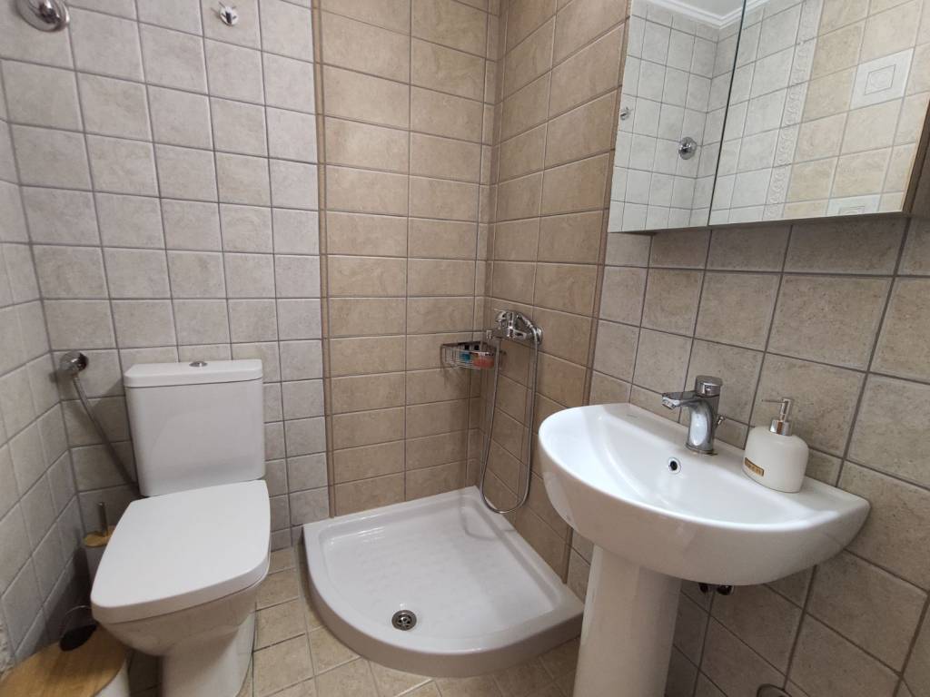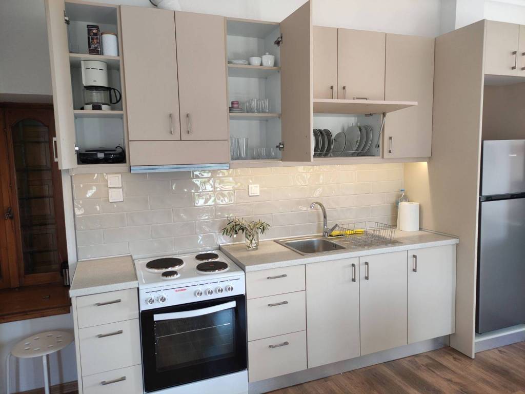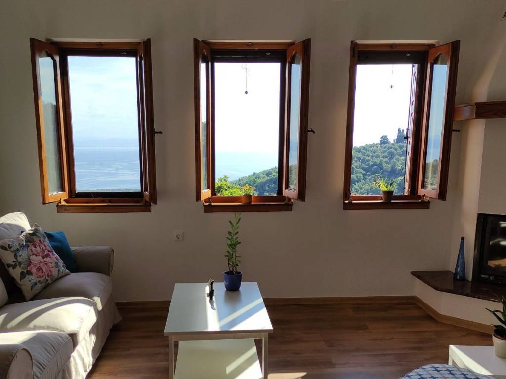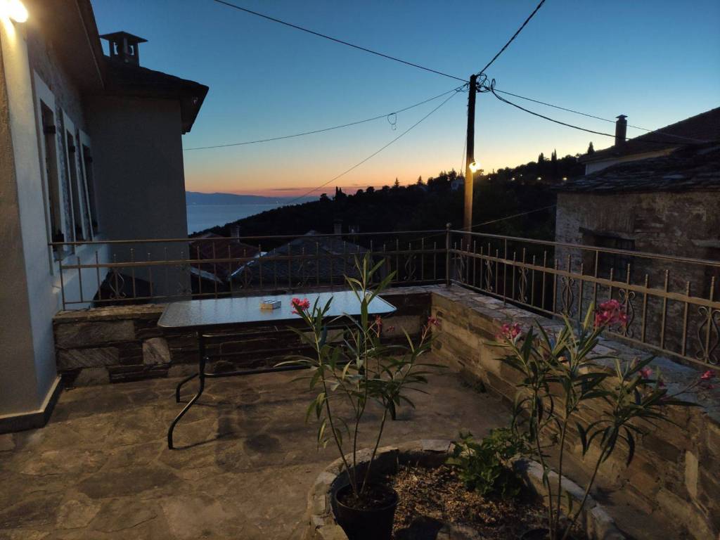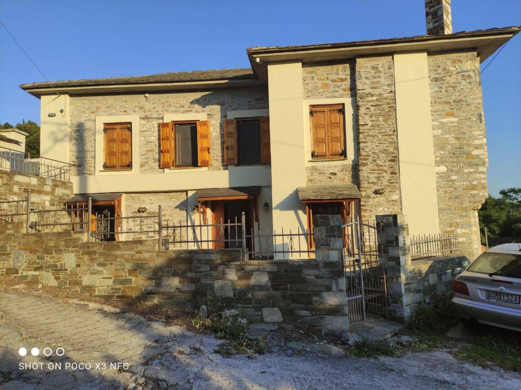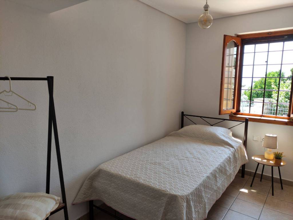 The house is a 120 sq.m. maisonette built with stone and wood. On the upper floor there is the kitchen, the living room and a W.C. On the lower floor there is a bathroom and three bedrooms. One bedroom features a large double bed, while the other two each have a comfortable single bed. In one of these rooms, an additional high-quality extra bed can be added, equipped with anatomical slats and a 12 cm mattress that ensures a comfortable sleep. The house is decorated in a modern, minimalist style that promotes calmness and relaxation. It is fully equipped and includes a washing machine, electric stove, refrigerator, 40-inch TV, air conditioning, Wi-Fi, all necessary kitchenware for cooking, as well as small appliances (steam iron, ironing board, coffee maker, toaster, hair dryer). The property also features two stone-paved courtyards on different levels, where at least one always offers shade, allowing guests to enjoy their breakfast or meals outdoors. Next to the house, there is private parking space for two cars.