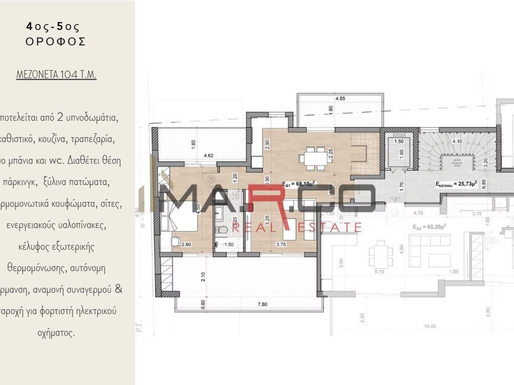 Maisonette For sale, floor: 4th, 5th (2 Levels), in Peristeri - Agios Antonios. The Maisonette is 104 sq.m.. It consists of: 3 bedrooms, 2 bathrooms, 1 wc and it also has 1 parkings (1 Underground). The property was built in 2025. Its heating is Personal with Heat pump, Air conditioning, Thermal insulation are also available, it has Alluminum, Thermal brake frames with Double glazed - Energy Efficient windows, the energy certificate is: A+ and its floors are Tiles, Wooden. The property's status is: Under construction, it is close to Metro, School, Super Market, City Center, 600 Meters from metro and it has NorthEast orientation. The Maisonette is Penthouse, With Facade, Bright, Airy, Sunny and it also has the following unique features and advantages: Window Screens, Elevator, Storage, Internal staircase, Security door, No shared expences, Night stream, Three phase current, Electric shutters, Car charger. Price: €335.000. MA.R.CO REALESTATE & CONSTRUCTION, contact phone: 6944855335, 2109650870, email: info@marco-realestate.gr, website: