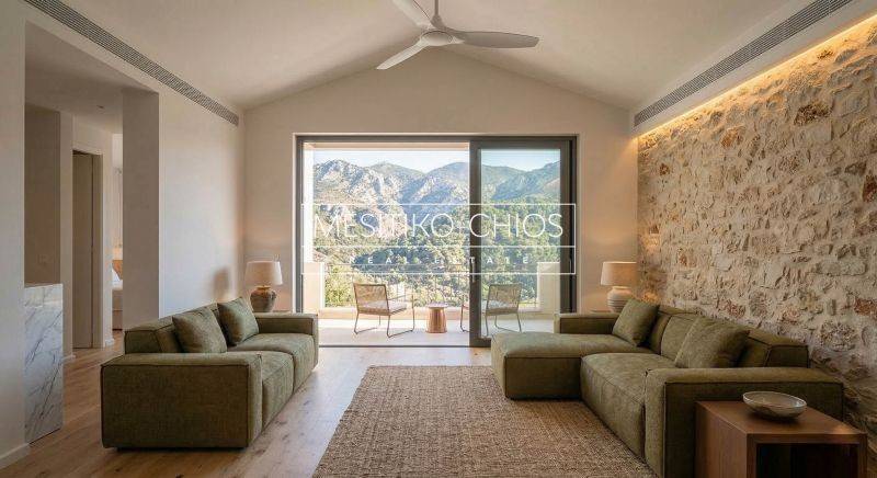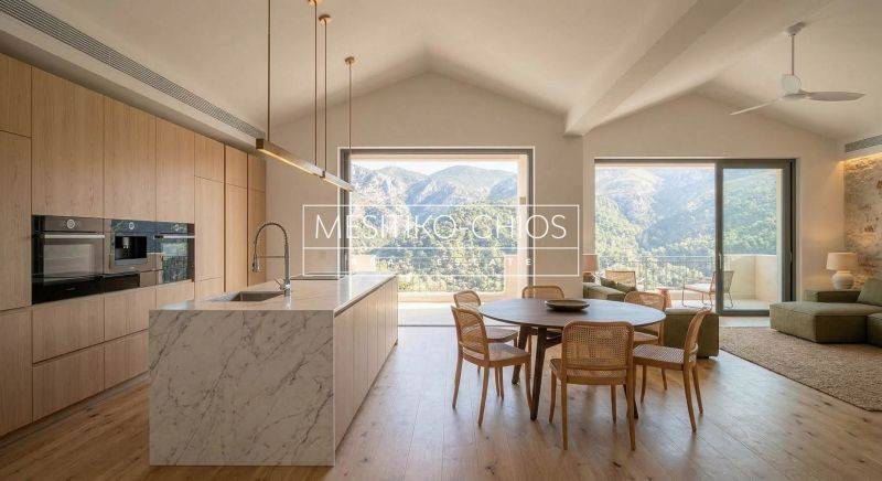 On the privileged floor of the complex in Vrontados, Chios, where the gaze balances between the imposing tranquility of the mountain and the immense serenity of the Aegean, a residence of high architectural aesthetics is being developed. The 94.08 sq m apartment is a residential retreat under construction, designed to offer a rare double view experience, through a modern and completely functional design.