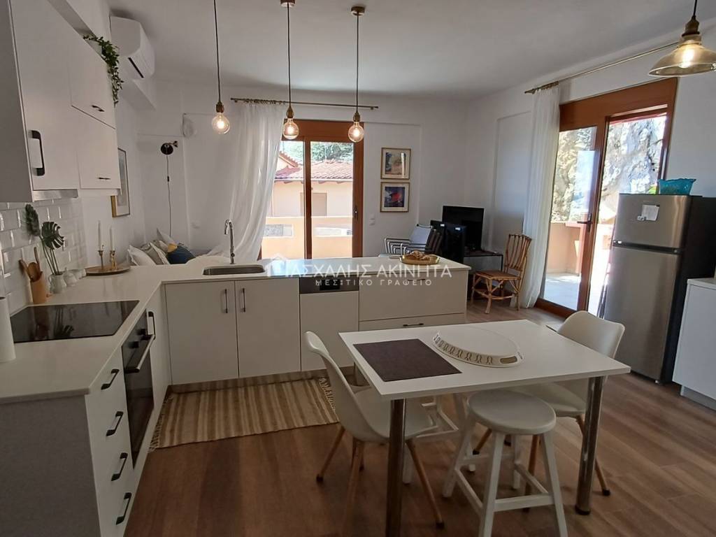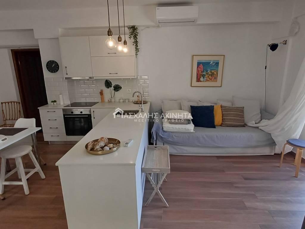 Fully furnished and electrically equipped, seaside 2-room apartment on the 1st floor of 50 sqm in a nice location. It has a single living room-kitchen area, 1 bedroom, 1 bathroom, air conditioning, solar, PPC meter, 2 balconies, mountain and sea view. Small pet accepted. It is given only for short-term rental. Rent price 500 euros. Our goal is to respect and serve the customer in finding the property they are looking for. For this purpose we use technology for the best description in what we undertake with rich visual material, photos and videos. Contact hours 9:00 am – 16:00 pm. Property code 20258.