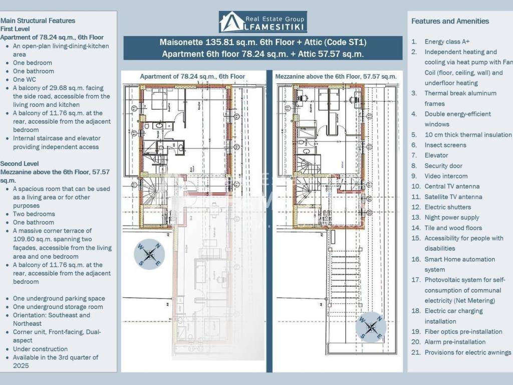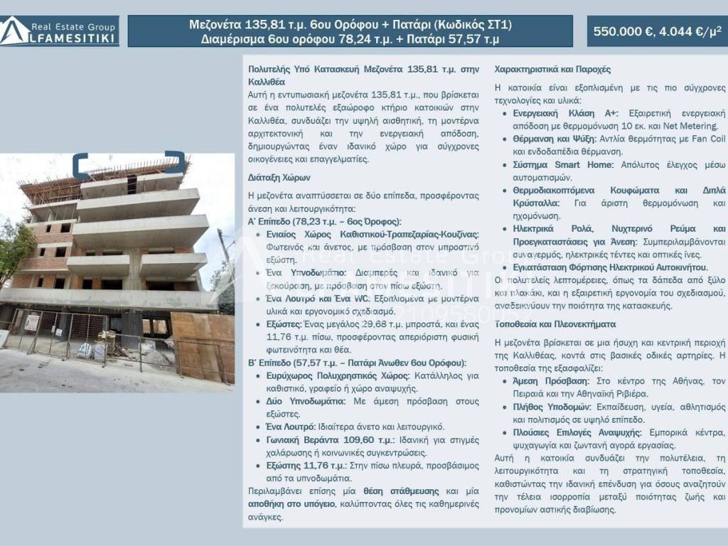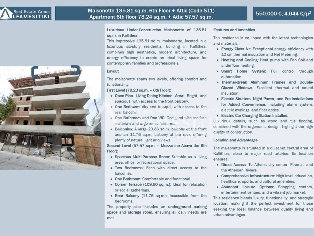 Luxurious Under-Construction Maisonette 135.81 sq.m. in Kallithea This impressive 135.81 sq.m. maisonette is part of a luxurious six-story residential building in Kallithea, blending modern aesthetics, contemporary architecture, and energy efficiency. It is designed for modern families and professionals seeking quality and comfort. Layout: The maisonette spans two levels: First Level (78.23 sq.m. – 6th Floor): • Open Plan Living-Dining-Kitchen Area: Bright and spacious, with access to a large 29.68 sq.m. front balcony. • One Bedroom: Airy and tranquil, with access to an 11.76 sq.m. rear balcony. • Bathroom and WC: Equipped with modern materials and ergonomic design. Second Level (57.57 sq.m. – Mezzanine Above 6th Floor): • Multi-Purpose Space: Ideal for a lounge, office, or recreational area. • Two Bedrooms: Both with access to balconies. • Bathroom: Spacious and functional. • Corner Terrace (109.60 sq.m.): Perfect for relaxation and social gatherings. • Rear Balcony (11.76 sq.m.): Accessible from the bedrooms. Additional Features: • Underground parking space and storage room for added convenience. Features and Amenities: • Energy Efficiency Class A+: With 10 cm insulation and Net Metering. • Heating and Cooling: Heat pump with fan coil units and underfloor heating. • Smart Home System: Full automation control. • Thermal Break Windows with Double Glazing: Excellent insulation and soundproofing. • Electric Shutters, Night Power Supply, and Pre-Installation for Comfort: Includes provisions for alarm systems, electric awnings, and fiber optics. • EV Charging Station Installation. Location Advantages: Situated in a peaceful yet central area of Kallithea, offering: • Immediate Access: To Athens center, Piraeus, and the Athens Riviera. • Comprehensive Infrastructure: Schools, healthcare, sports, and cultural amenities. • Entertainment and Shopping: Proximity to markets, malls, and vibrant business hubs. This maisonette combines luxury, functionality, and a prime location – a perfect investment for those seeking a superior urban lifestyle. ► For more details about the property, the building or the area as well as to visit the property you can visit the page - https://www.alfamesitiki.gr/pdetails?id=Α-146273&lng=en ► For opportunities in similar properties and in other areas visit our page at alfamesitiki.gr ► Last update 24/3/2026 ► Follow us on Facebook www.facebook.com/alfamesitiki.gr