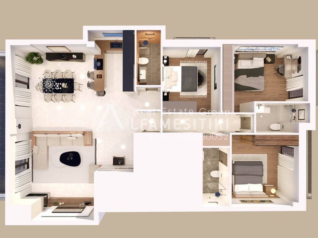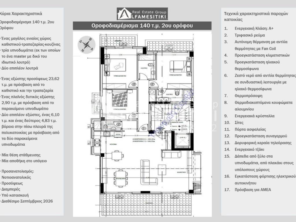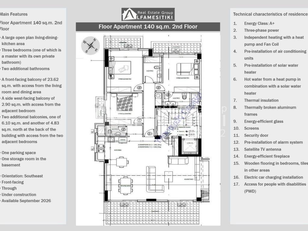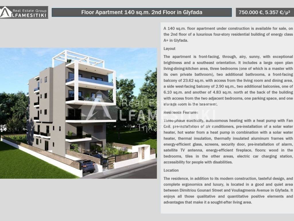 A 140 sq.m. floor apartment under construction is available for sale, on the 2nd floor of a luxurious four-story residential building of energy class A+ in Glyfada. Layout The apartment is front-facing, through, airy, sunny, with exceptional brightness and a southeast orientation. It includes a large open plan living-dining-kitchen area, three bedrooms (one of which is a master with its own private bathroom), two additional bathrooms, a front-facing balcony of 23.62 sq.m. with access from the living room and dining area, a side west-facing balcony of 2.90 sq.m., two additional balconies, one of 6.10 sq.m. and another of 4.83 sq.m. north at the back of the building with access from the two adjacent bedrooms, one parking space, and one storage room in the basement. Residence Features Three-phase electricity, autonomous heating with a heat pump with Fan Coil, pre-installation of air conditioners, pre-installation of a solar water heater, hot water from a heat pump in combination with a solar water heater, thermal insulation, thermally insulated aluminum frames with energy-efficient glass, screens, security door, pre-installation of alarm, satellite TV antenna, energy-efficient fireplace, floors: wood in the bedrooms, tiles in the other areas, electric car charging station, accessibility for people with disabilities. Location The residence, in addition to its modern construction, tasteful design, and complete ergonomics and luxury, is located in a good and quiet area between Dimitriou Gounari Street and Vouliagmenis Avenue in Glyfada. It enjoys all those qualitative and quantitative positive elements and advantages that make it a sought-after living area. ► For more details about the property, the building or the area as well as to visit the property you can visit the page - https://www.alfamesitiki.gr/pdetails?id=Α-146265&lng=en ► For opportunities in similar properties and in other areas visit our page at alfamesitiki.gr ► Last update 30/3/2026 ► Follow us on Facebook www.facebook.com/alfamesitiki.gr