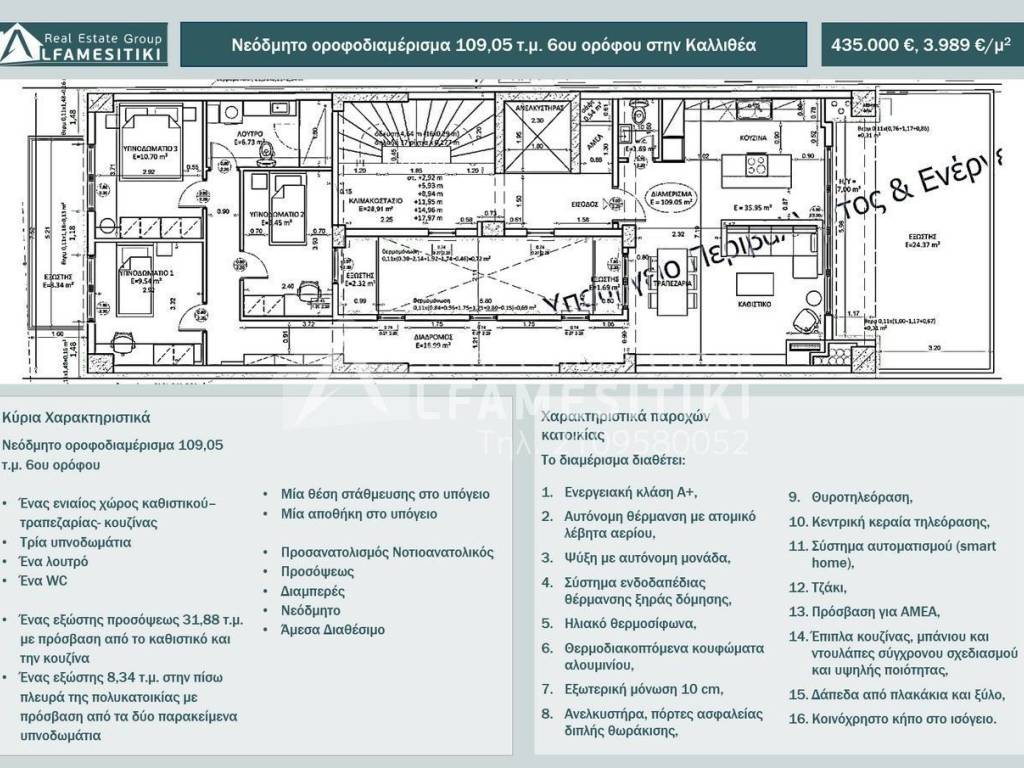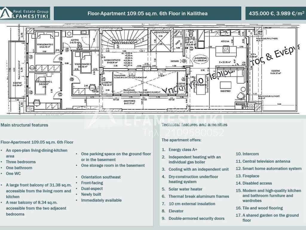 For sale: newly constructed floor-apartment, 109.05 sq.m., on the 6th floor of a luxurious eight-story residential building in Kallithea. Space Layout The apartment is front-facing, dual-aspect, airy, and sunny, with a southeast orientation. It includes a particularly spacious open-plan living-dining-kitchen area, three bedrooms, one bathroom, one WC, a large front balcony of 31.38 sq.m. accessible from the living room and kitchen, a rear balcony of 8.34 sq.m. accessible from the two adjacent bedrooms, one parking space, and one storage room in the basement. Technical features and amenities The apartment offers: energy class A+, independent heating with an individual gas boiler, cooling with an independent unit, dry-construction underfloor heating system, solar water heater, thermal break aluminum frames, 10 cm external insulation, elevator, double-armored security doors, intercom, central television antenna, smart home automation system, fireplace, disabled access, modern and high-quality kitchen and bathroom furniture and wardrobes, tile and wood flooring, and a shared garden on the ground floor. The construction is luxurious and aesthetically pleasing both externally and internally. It is characterized by its minimalist design, with attention to achieving optimal space utilization, functionality, views, and orientation. Location The residence is located in a quiet area in the center of Kallithea, offering an ideal location that combines the tranquility of home life with proximity to the vibrant city center, access to major roads, and public transportation, making it an ideal choice for families and active individuals alike. ► For more details about the property, the building or the area as well as to visit the property you can visit the page - https://www.alfamesitiki.gr/pdetails?id=Α-146242&lng=en ► For opportunities in similar properties and in other areas visit our page at alfamesitiki.gr ► Last update 27/3/2026 ► Follow us on Facebook www.facebook.com/alfamesitiki.gr