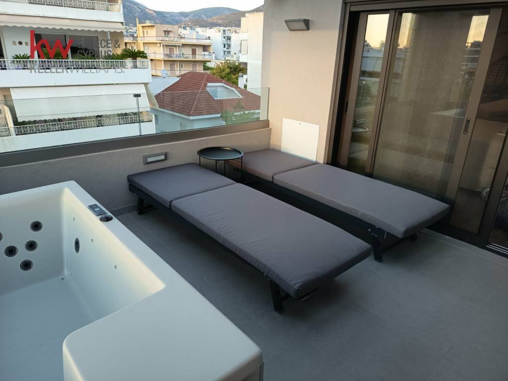 Maisonette For rent, floor: 4th, 5th (2 Levels), in Glyfada. The Maisonette is 80 sq.m.. It consists of: 1 bedrooms, 2 bathrooms, 1 kitchens, 1 living rooms, while it has the following parkings: 2 Covered. The property was built in 2021. Its heating is Autonomous with Oil, Underfloor heating, Air conditioning, Solar water system, Ventilation system, Sound insulation, Thermal insulation, Radiator, Thermal facade are also available, it has Alluminum frames with Double glazed - Energy Efficient windows, the energy certificate is: A+ and its floors are Tiles. The property's status is: New development, Excellent condition, it is close to Transportation, School, Square, Kindergarten, Public market, Super Market, Mall, Entertainment centers, Port, Cafe/Restaurants, Local market, it has Public square, Park, Sea, Nature, Openness, Panoramic, Unobstructed view. The Maisonette is Painted, Furnished, Bright, Airy, Sunny, Detached, Seaside, Upper level house, Luxury, Modern and it also has the following unique features and advantages: Window Screens, Tents, Elevator, Jacuzzi, Electric Appliances, Energy fireplace, Storage, Internal staircase, Security door, CCTV, Security alarm, Security cameras, Grass, Trees, Quiet neighborhood, Electric shutters. Price: €2.500. KW Cosmos, contact phone: 2121073000, email: kwcosmos@kwgreece.gr, website: