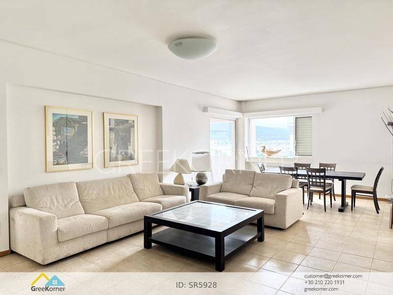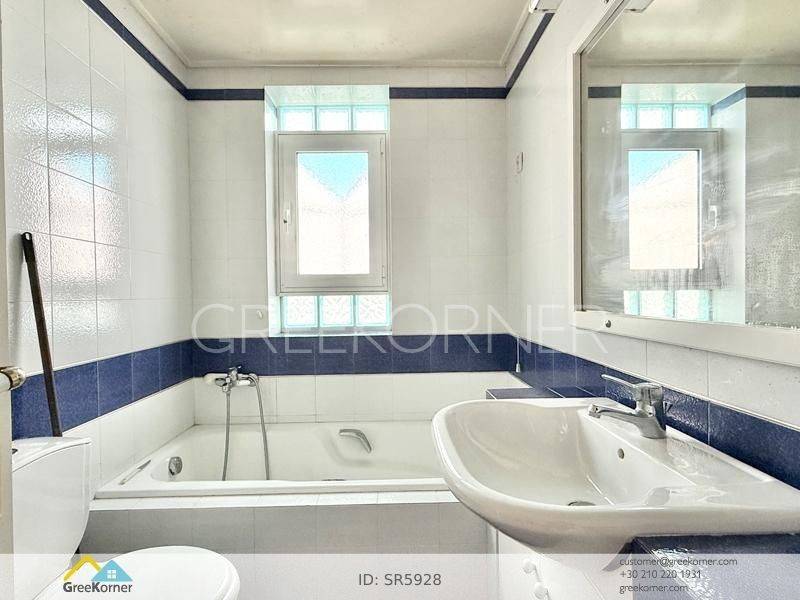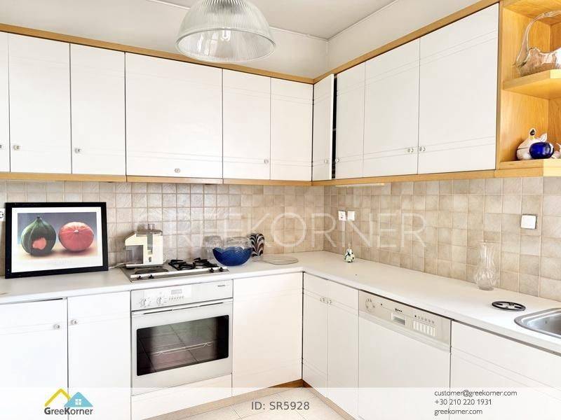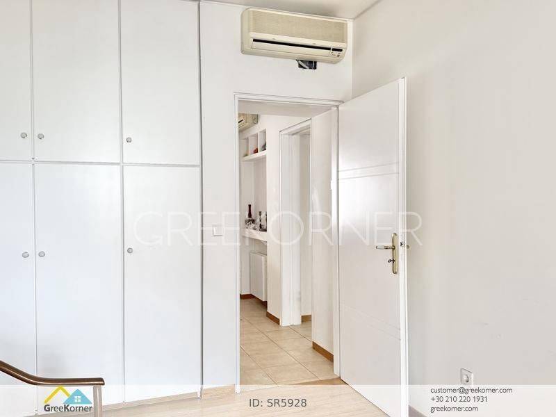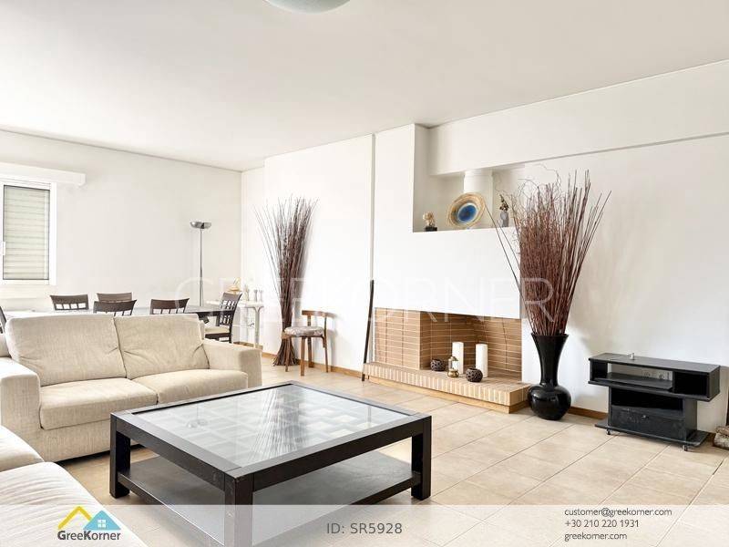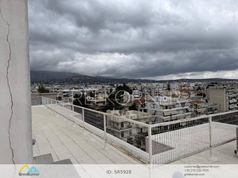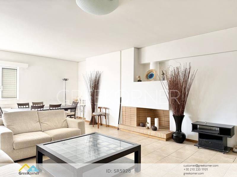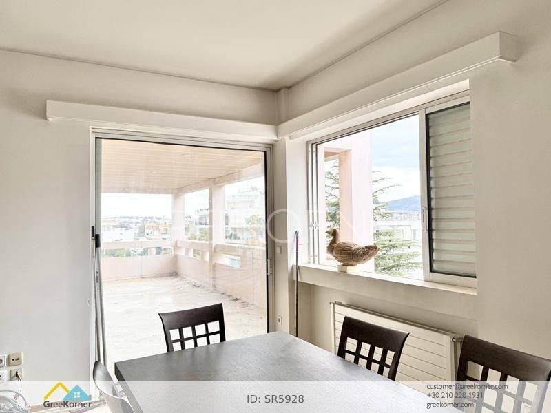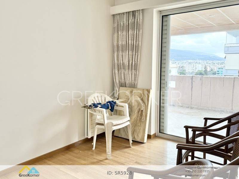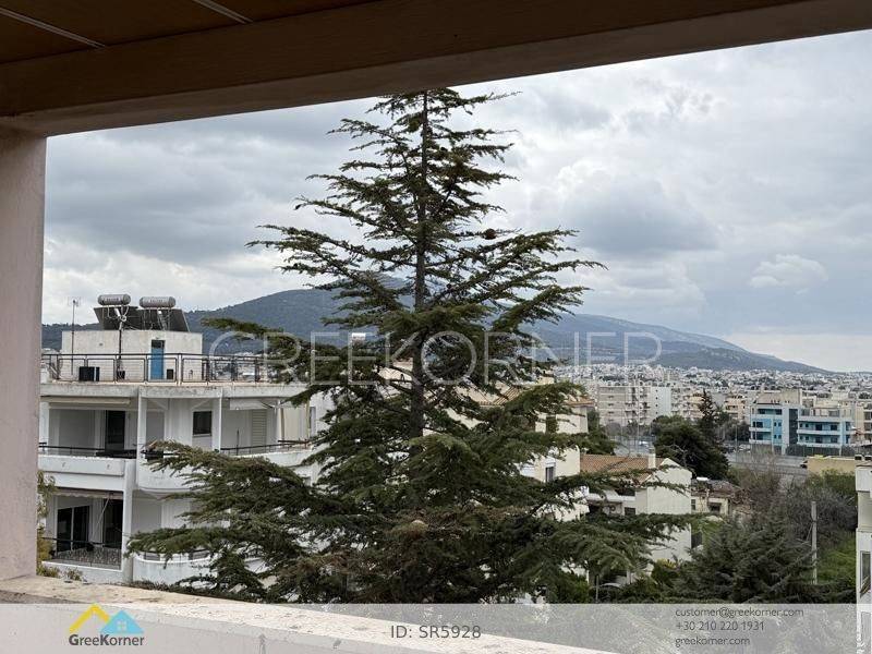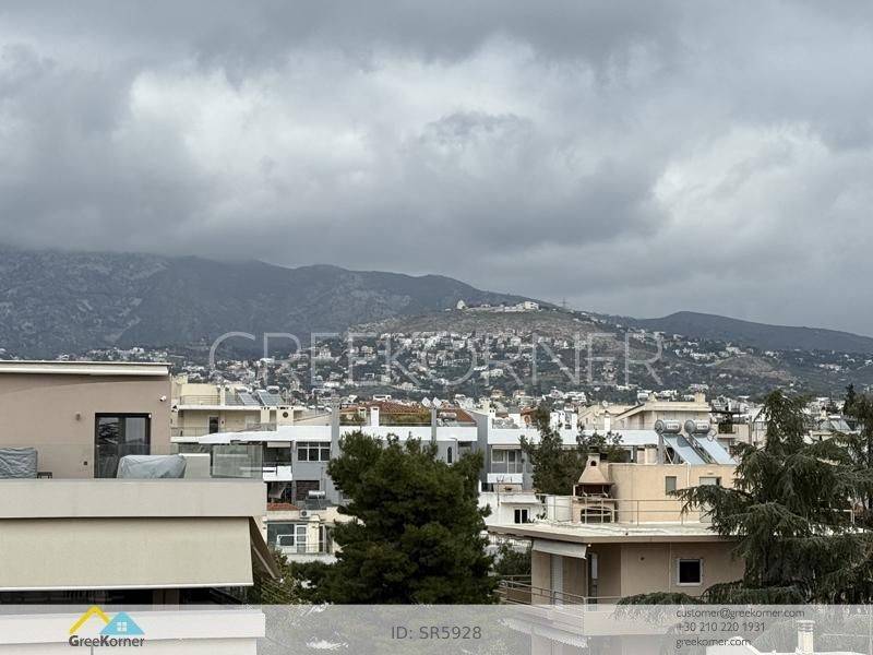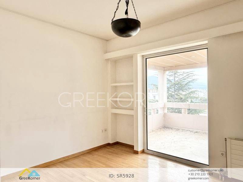 Vrilissia, Centre - Apartment 123sqm bedrooms 3, levels 1, 5th, penthouse, very good condition, year built 1992, energy class C, living room, hall, kitchen, bathroom, wc, heating type: autonomous (oil), air condition, parking covered, quiet, dual aspect apartment, luminous, corner, mountain view, internal plot, storage space 10sqm, solar heater, boiler, fireplace, balconies, large balconies, balcony 60sqm, elevator, built in appliances, aluminum frames, double glazed windows, wood & tile floors, separate kitchen, three phase electricity, secure door, video doorbell, pets allowed, within city plan, residential zone, access from asphalt.
