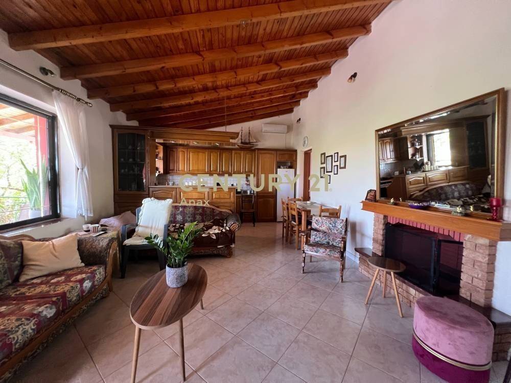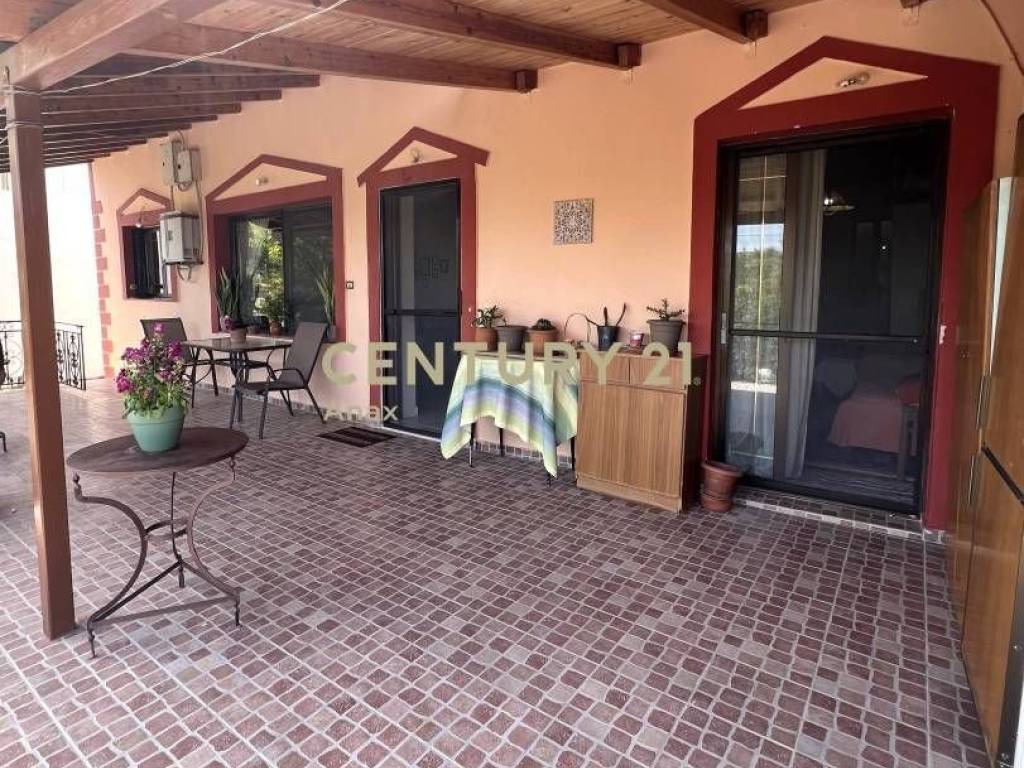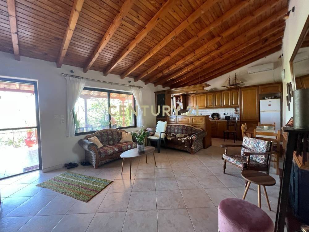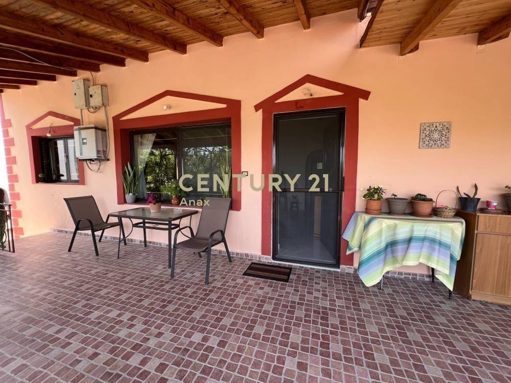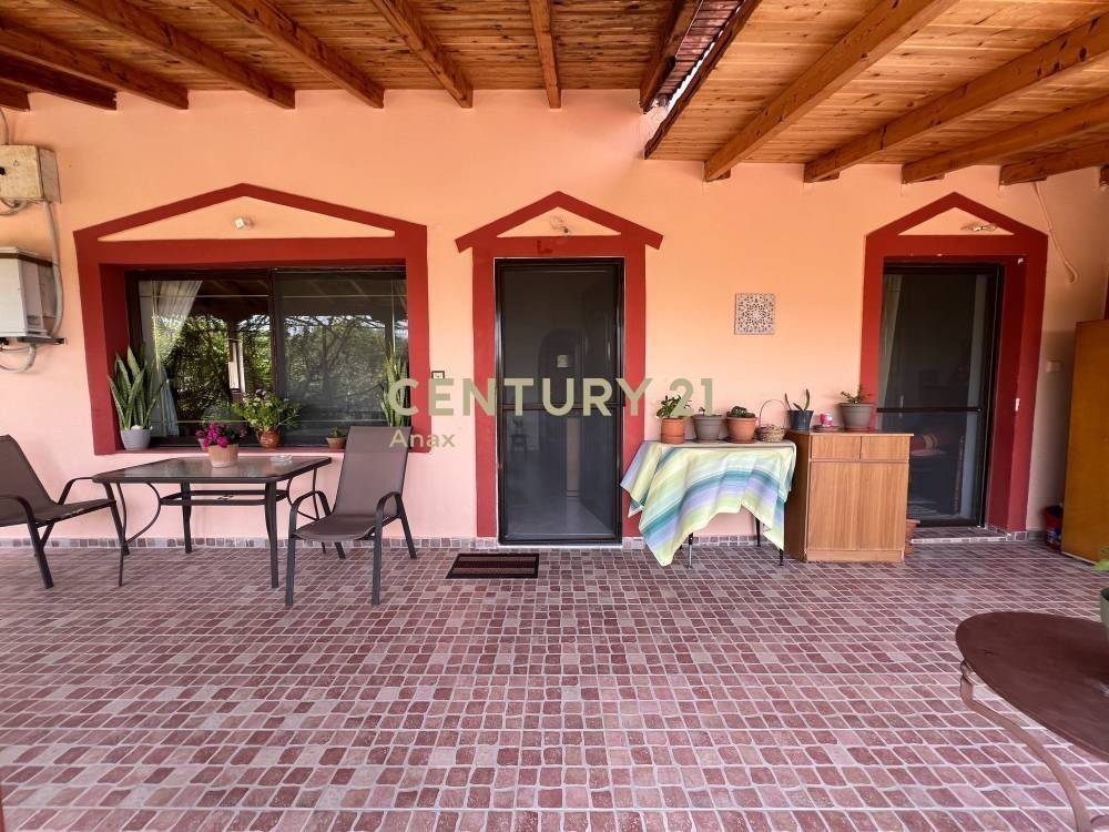 A large covered veranda provides unobstructed panoramic views of both the sea and the mountains, while the surrounding garden with fruit trees enhances privacy and quality of living.