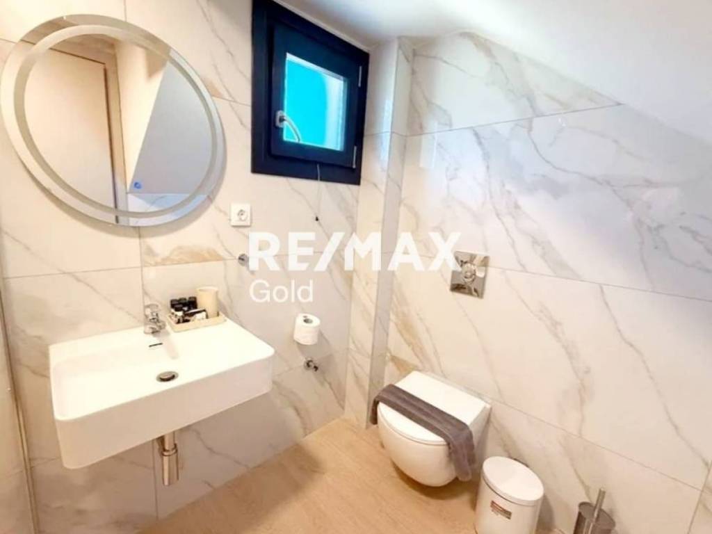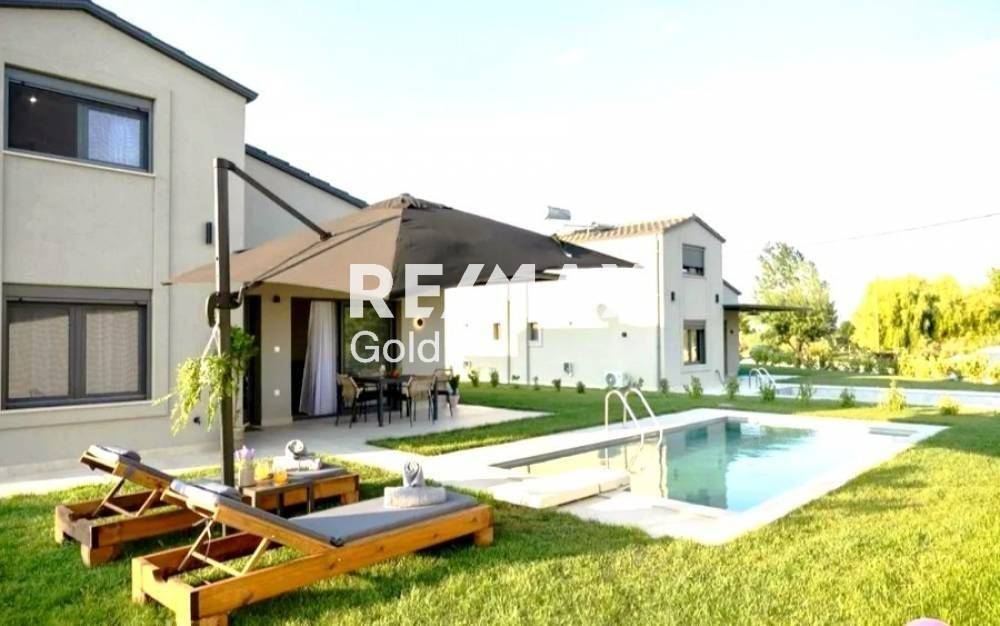 It has a panoramic view of the endless blue of the Aegean Sea & the mythical Mount Olympus. It is located in a private fenced plot and has a lush garden with automatic irrigation & a private swimming pool for moments of relaxation & coolness.