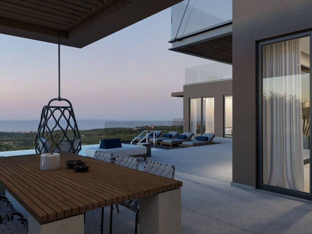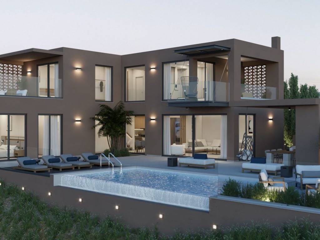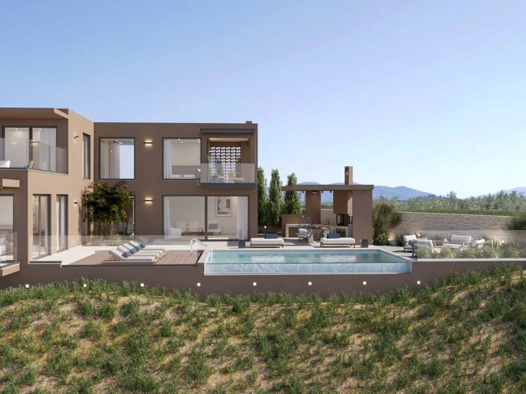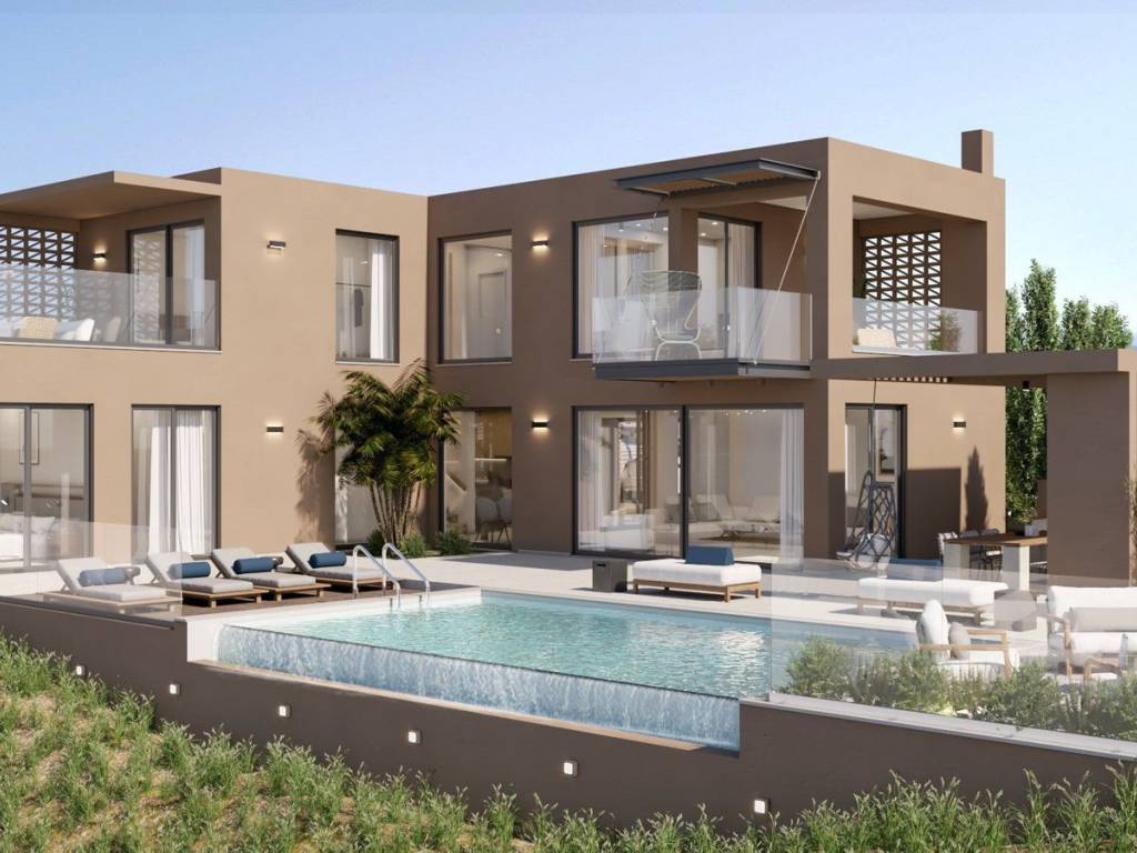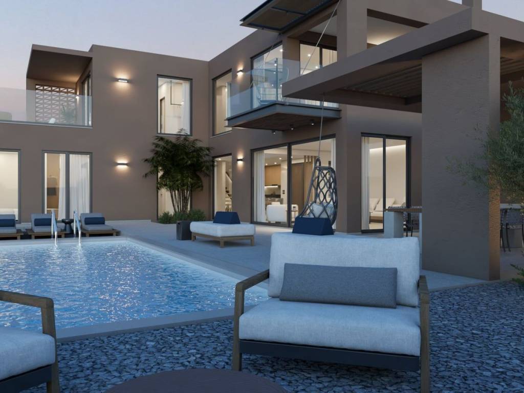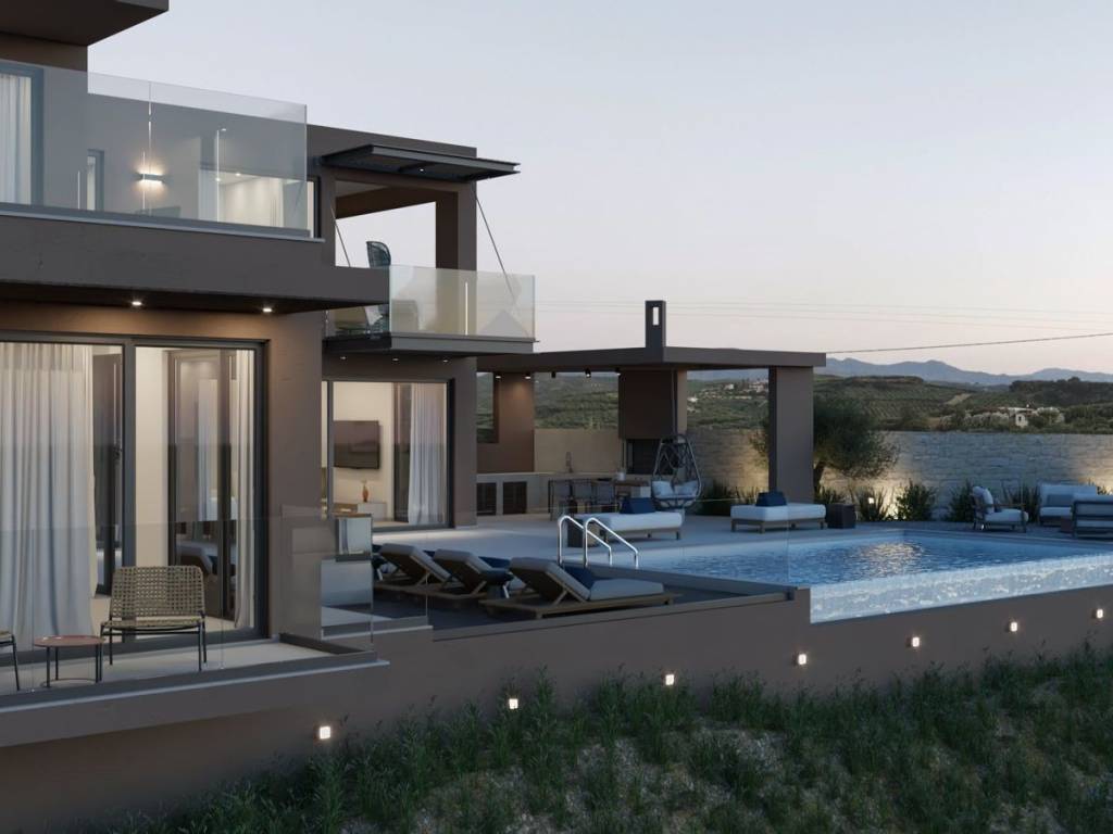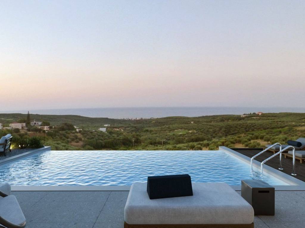 This splendid off-plan residence (196 sqm) offers unrivalled views over the Mediterranean Sea, the North coast of Crete and the eye-striking sunsets - a grand panorama that can be literally enjoyed from every corner of the property. It combines privacy with reasonable distance to some of the island's top hangouts.Entering the site from the back side, visitors are guided down to the main house via a wide white-washed pathway. Next to it, a sleek wooden carport can host up to two cars.The two-floors, 3 en-suite bedrooms and all common areas bear all the hallmarks of a tasteful, luxury accommodation. This Greek villa comprises of crisp earthy tone cubes with big windows and doors. Inside, rooms have surprising volumes thanks to high ceilings, providing comfortable movement between the seamlessly connected rooms.The house layout works as a complementary element of the plot, ensuring and revealing the astonishing view as it takes advantage of the site's inclination. The extensive open plan living space spills out to the terrace and swimming pool (42 sqm). The ground floor en-suite bedroom (23 sqm) is located towards the garden, having visual connection to the pool from one side and mesmerising views to the Platanias coastline from its private balcony. Almost every space is oriented towards the view, has natural light and access to the outdoor, a characteristic of Mediterranean architecture.A wooden stairway links organically the two levels. From there, a corridor guides the way to the remaining two bedrooms and the storeroom. Both bedrooms lead out to north-oriented balconies, which feel like an extension to the interior. You can walk out and enjoy the heightened views towards the sea and the pool garden.The real key point is the arrangement of the outdoor lounge â perfect for watching the sun set over the Aegean Sea. The developer's intention is to design a holiday residence that would allow to enjoy being outside throughout the day. The outdoor spaces are generously offering a variety of uses, embracing the outdoor way of living, an eat-in dining area and several lounging areas, both covered and exposed to the sun.Splash around while taking breathtaking vistas from the infinity pool, enjoy the Greek sun lying on the sun beds or enjoy a cold drink at the low seating lounge which is set next to the pool. A long wooden dining table sits at the right top corner of the courtyard to host your dining with friends and family. Fitted-lamps create a romantic yet inviting aura through the whole space.
