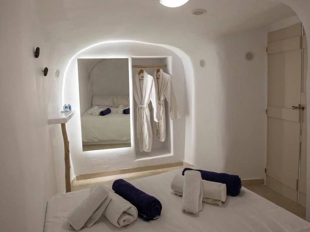 Descending the whitewashed stairs, the ground floor welcomes you with a tranquil yet stylish 25 sqm courtyard. Entering inside, an open-air living room dining area awaits. This level boasts three bedrooms. The master bedroom with spacious wardrobes and handmade furniture leads to an ensuite bathroom with a shower, a bathtub and twin sinks. Going down some stairs, the second bedroom, which used to be a well, provides a queen-sized bed and absolute tranquility. Off the main area, there is the third doubleâbedroom and the second bathroom with a shower.