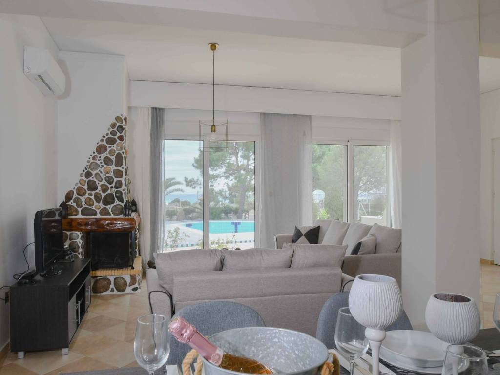 Each villa features a welcoming ground floor with a bright open-plan living and dining area, complete with a cosy fireplace and a fully equipped kitchen. Large windows open out to serene views of the pool and the sea, creating a seamless connection between indoor and outdoor living. A bathroom with a shower is also located on this level.